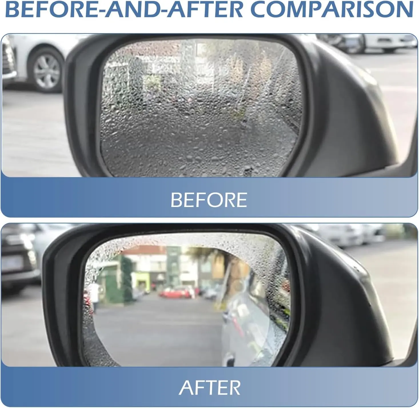 ·Easy Installation: Firstly, clean the surface of the rear view mirror thoroughly. Then, peel off the white protective film and carefully apply the sticker to the mirror surface. Gently smooth it out to make sure there are no air bubbles. Finally, peel off the blue protective film and you can enjoy a clear view.