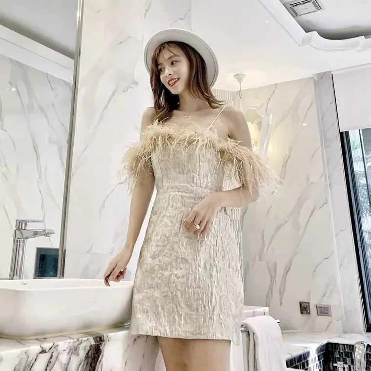 2025 Spring/Summer Off-Shoulder Feather Evening Dress Elegant Reception Dress with Straps and 3D Pattern