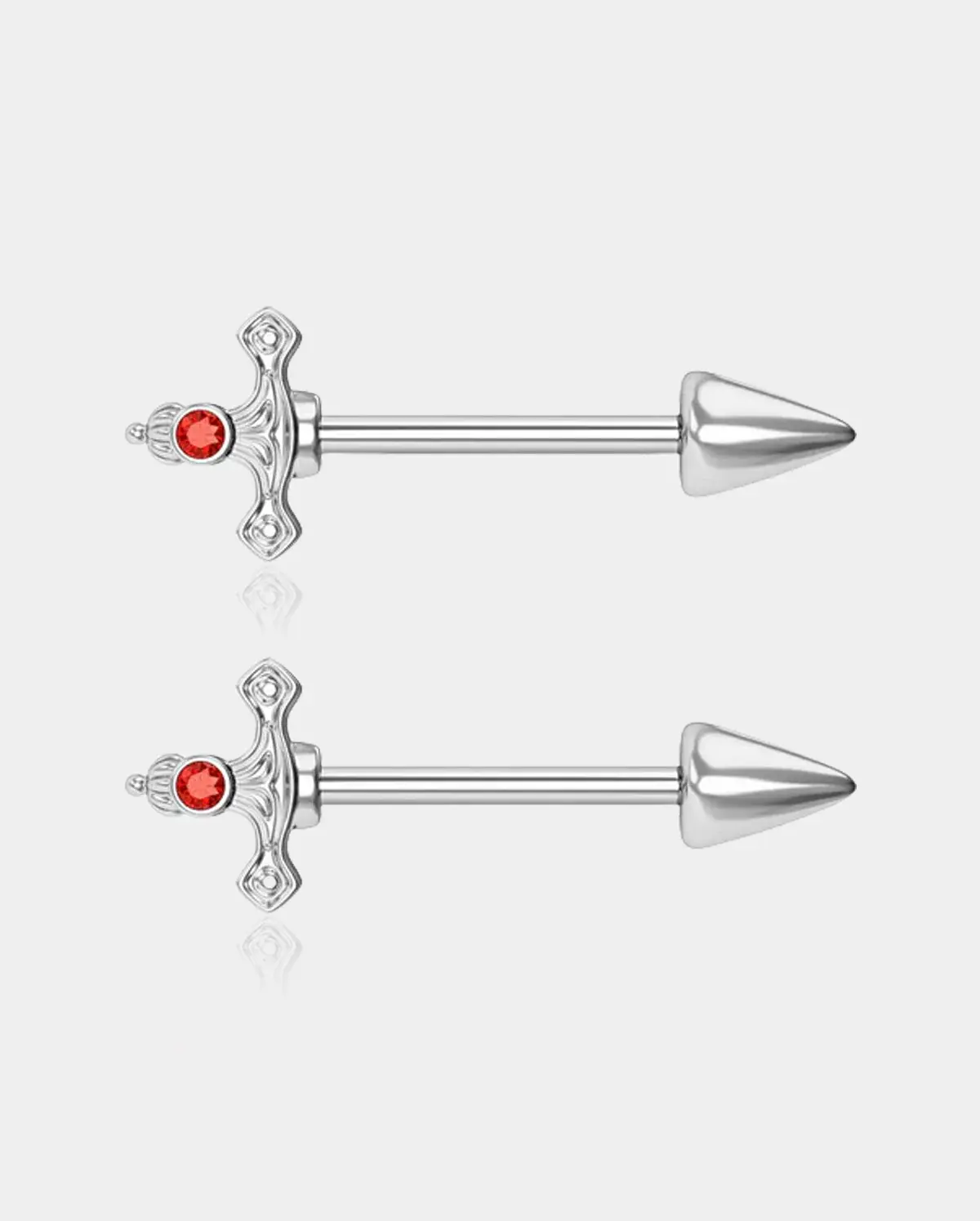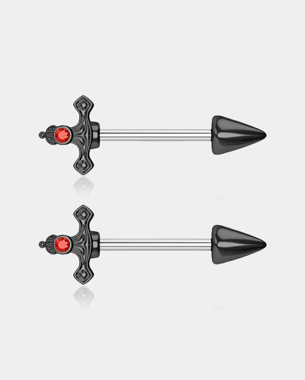TheDagger Nipple Barbellis an interesting option for your nipple piercings! Each dagger has a red gem mosaicked in the handle and there are three colors available, black, silver, and gold.