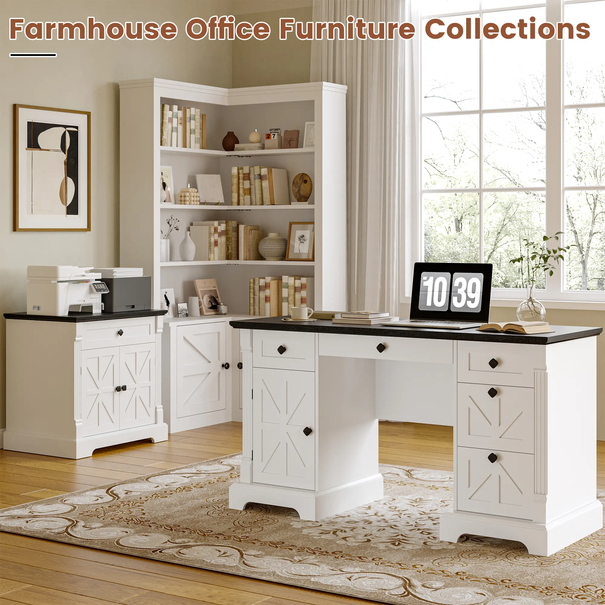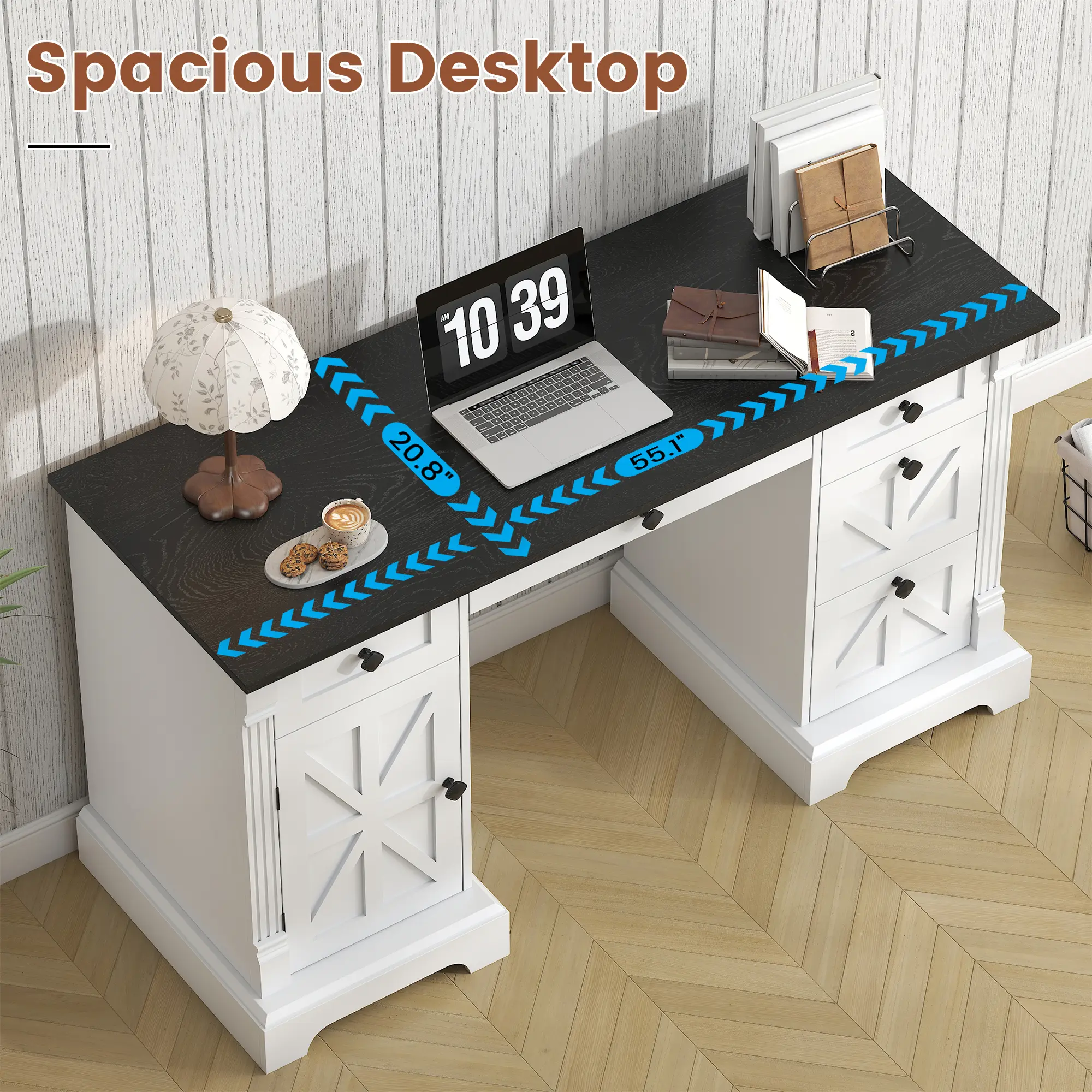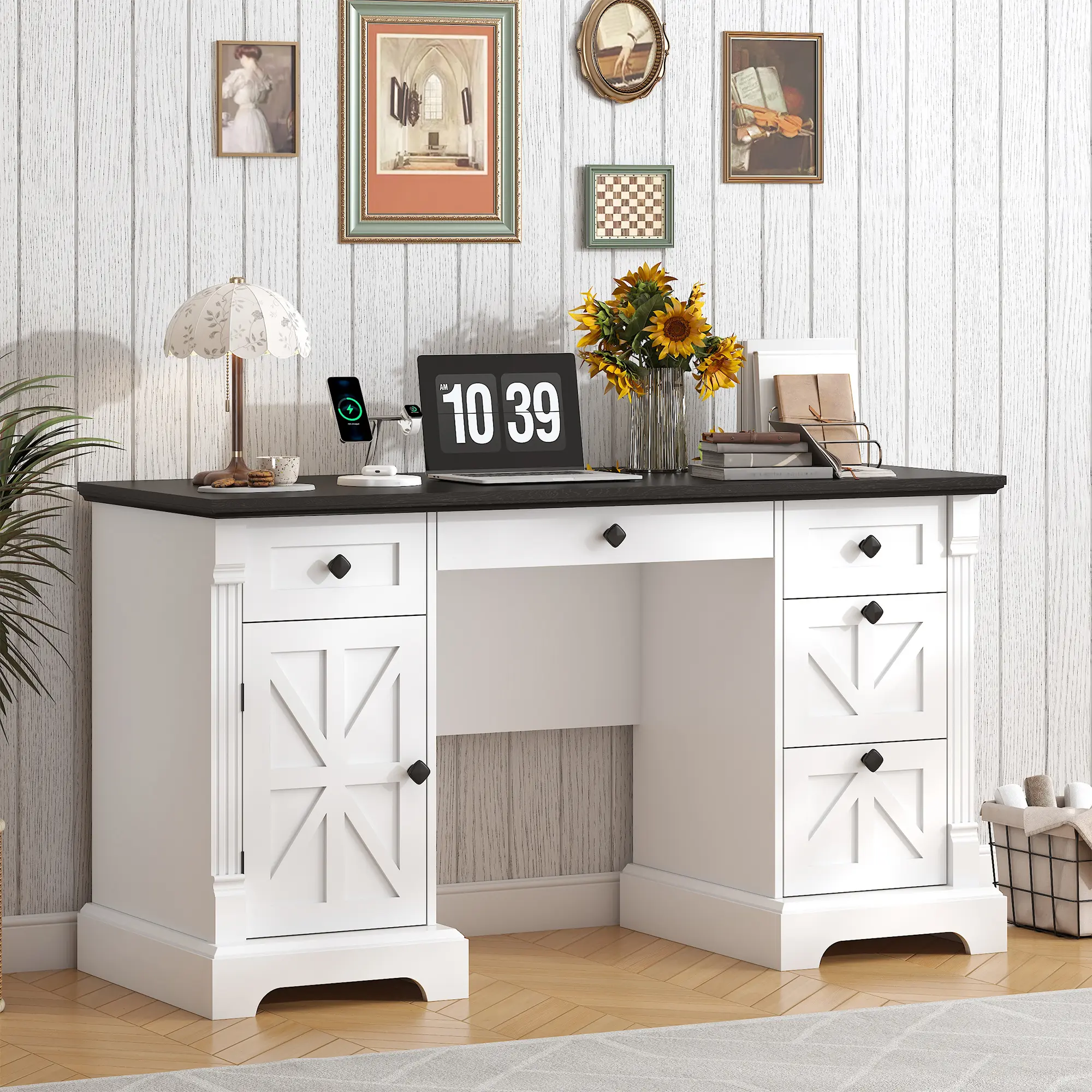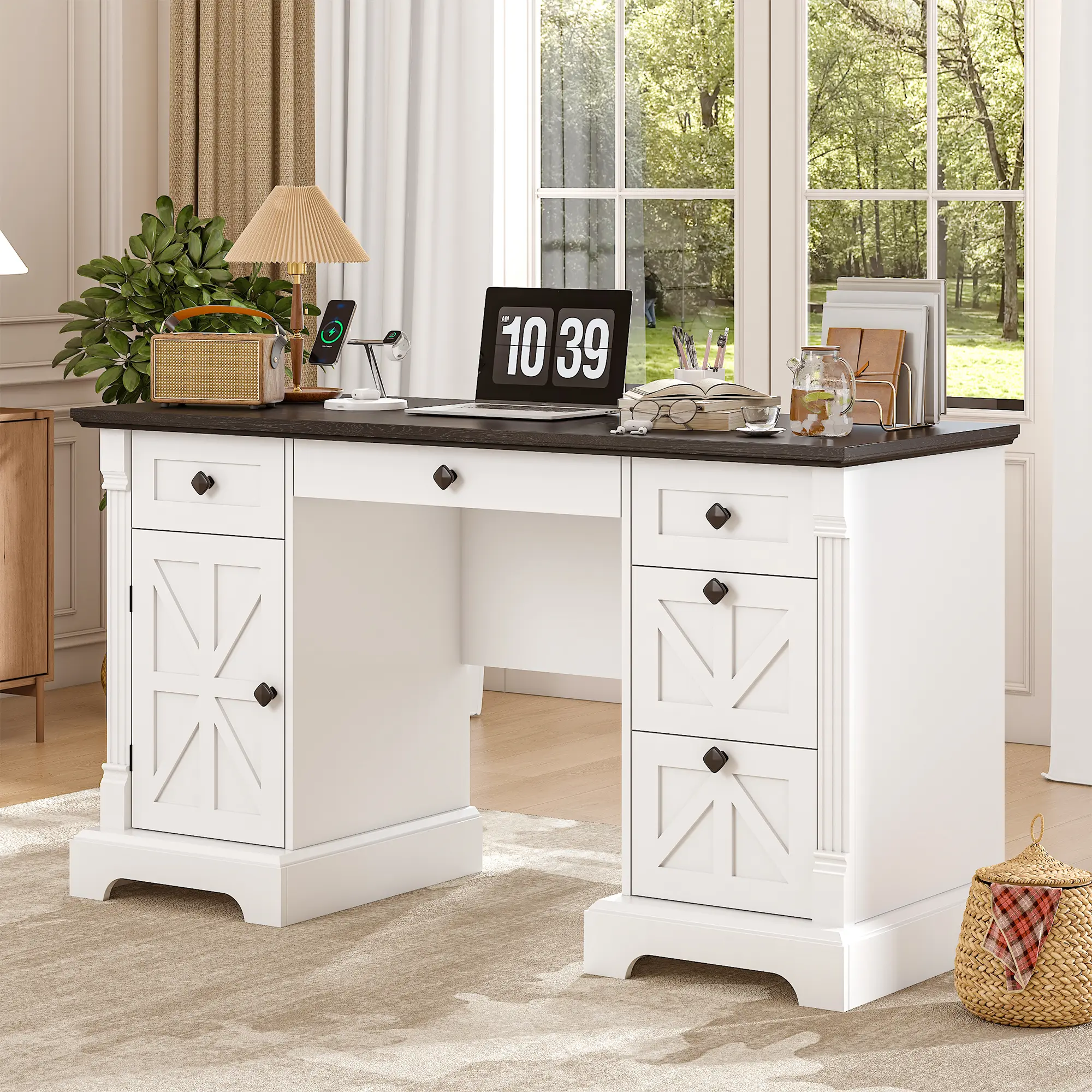📐 With a classic barn door design and elegant column details, this desk is a statement piece. The neutral white & black finish blends with farmhouse, modern, traditional, and industrial decor. Crafted from high-quality solid and engineered wood, it ensures stability. Clear assembly instructions and necessary tools are included. Set it up in under 2 hours without professional help.