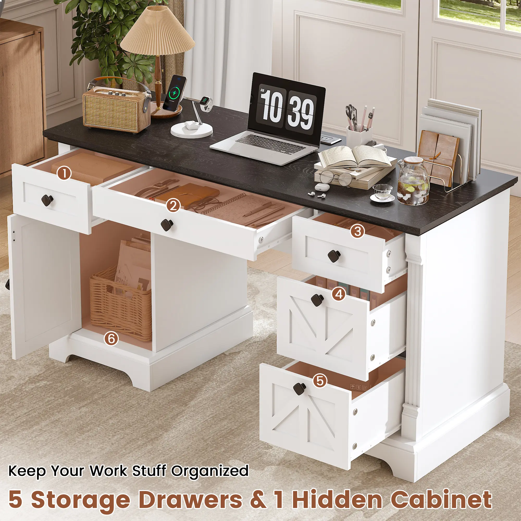 📦 Stay organized with our 5-drawer + 1 hidden cabinet storage system. 2 small drawers for pens and stationery. 1 center drawer for notebooks and files. 2 deep barn-style drawers for books and folders. 1 hidden cabinet for personal belongings. Smooth metal drawer slides ensure quiet, easy access. The magnetic-closure cabinet keeps items secure.