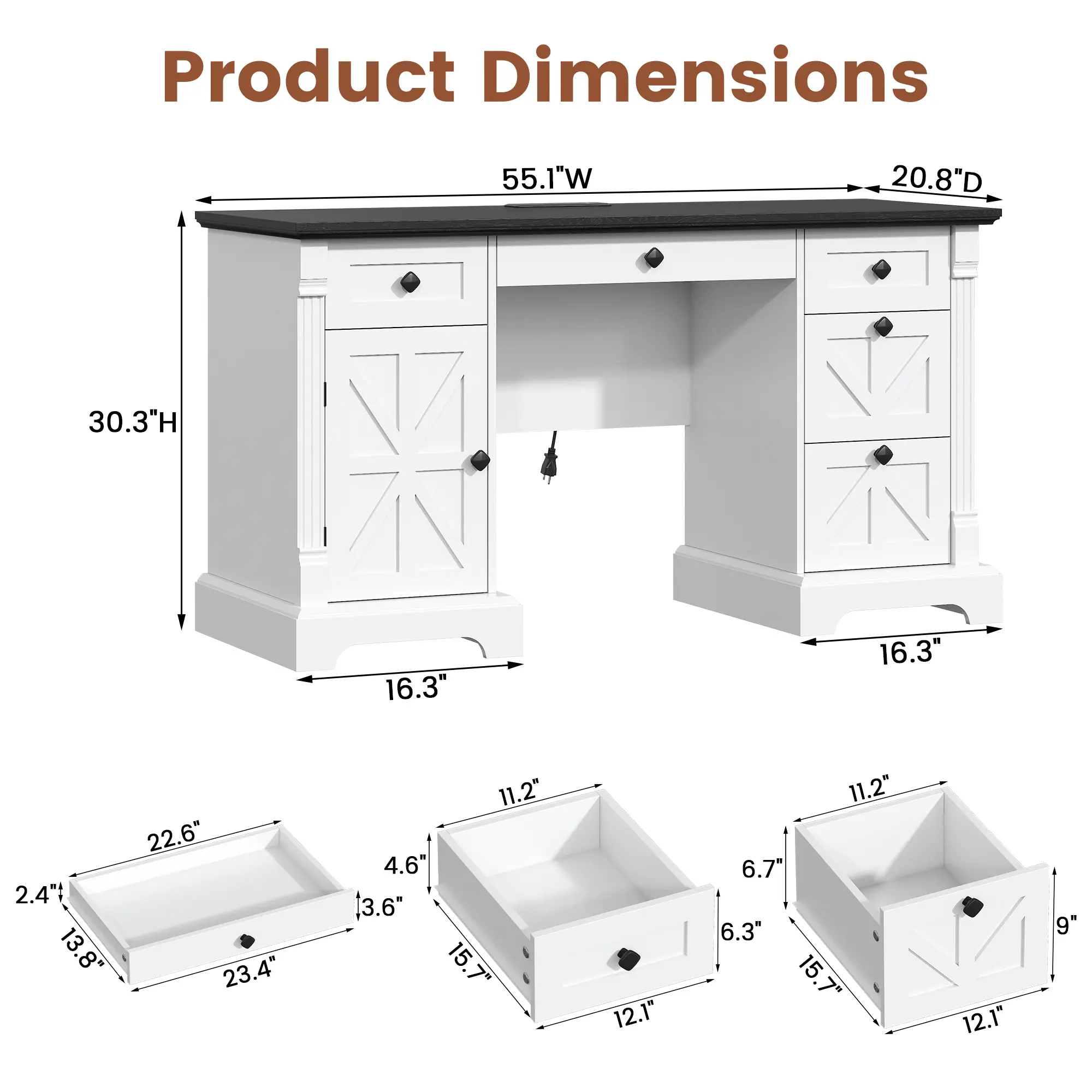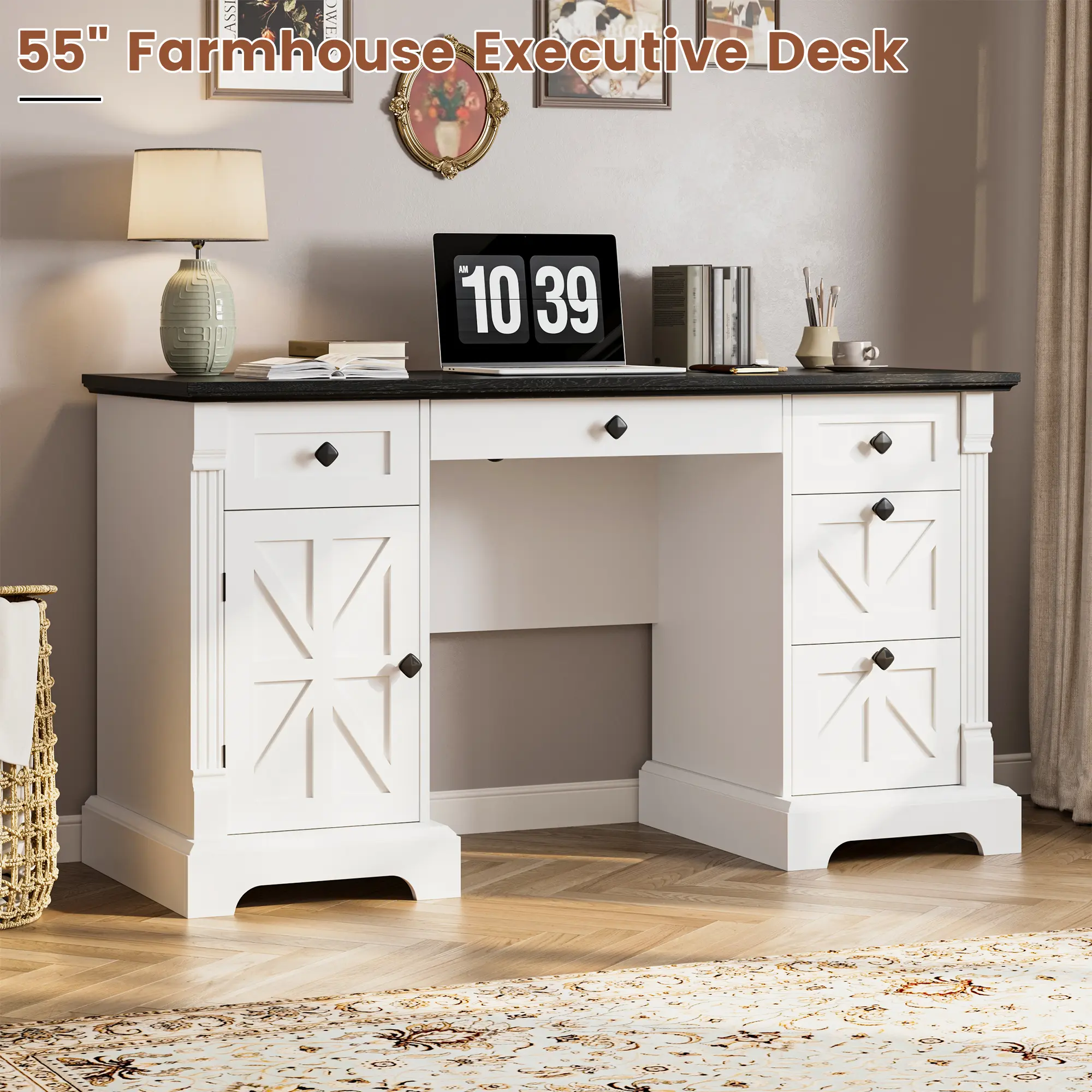 ✨ Transform your home office with our 55" farmhouse executive desk. It combines timeless style with modern convenience. Perfect for work, study, or hobbies, this desk is a centerpiece for your workspace. Measuring 55.1"W × 20.8"D × 30.3"H, it features a scratch-resistant wood desktop. The sturdy construction supports up to 200 lbs, ensuring long-lasting use. The white & black two-tone finish adds rustic charm, complementing any decor.