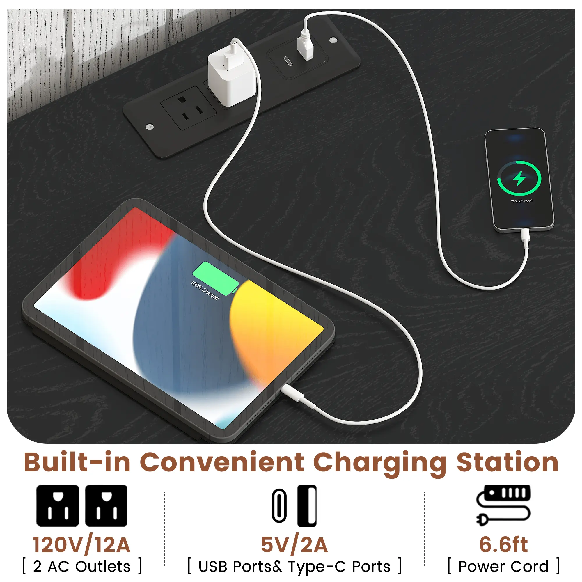 🔌 No more messy cords! Our desk includes a built-in charging hub with 2 AC outlets, 2 USB ports, and 1 Type-C port. Charge your devices right at your desk, keeping it tidy. The 6.6ft power cord and cable grommet ensure easy cord management, eliminating clutter. Stay productive with all your devices powered up.