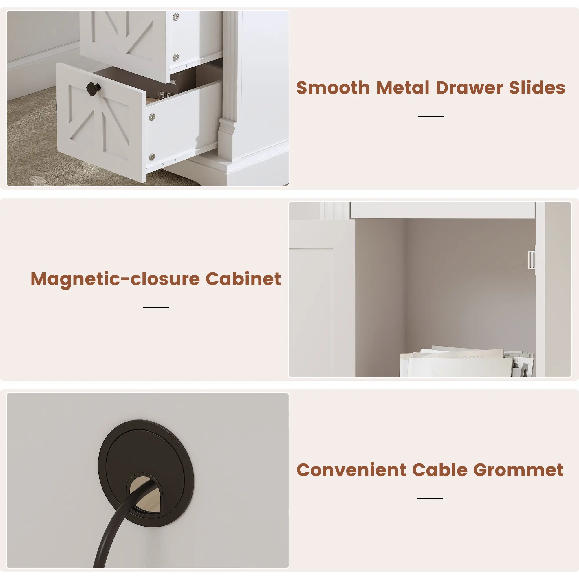📞 We prioritize durability and convenience. Our 24/7 customer service team is ready to assist with any questions or issues. Enjoy a worry-free shopping experience. The smooth metal drawer slides, magnetic-closure cabinet, and cable grommet are designed for long-lasting, hassle-free use.