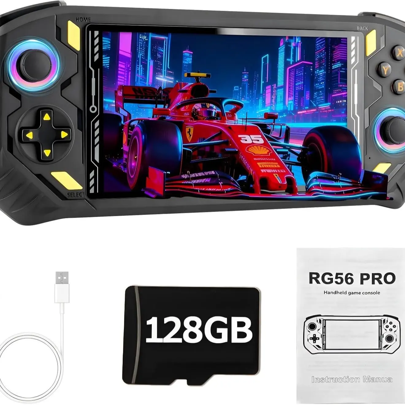 ·5.5-Inch IPS Full HD Display:This RG56 PRO retro handheld game console features a 5.5-inch IPS full HD display screen with a resolution of up to 1280x720 HD. The picture is clear and smooth, with every frame coming to life. This handheld console's screen boasts a wide viewing angle and an anti-glare coating, effectively reducing eye strain, making it ideal for extended gaming sessions. As a user-friendly retro handheld game console, it ensures a clear and smooth visual experience whether you're playing classic games, modern retro-style games, or fifth-generation 3D games