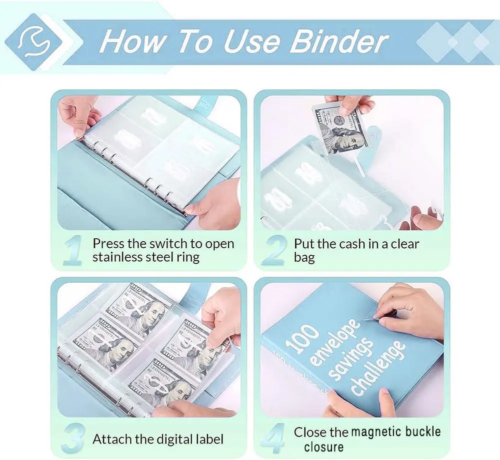Simple to Use: Step 1: Write down your goal on the tracker. Step 2: Save money equal to the number of the envelope. Step 3: Mark the corresponding number on the challenge tracker. When you mark all the numbers, you have completed the challenge and achieved the goal.
