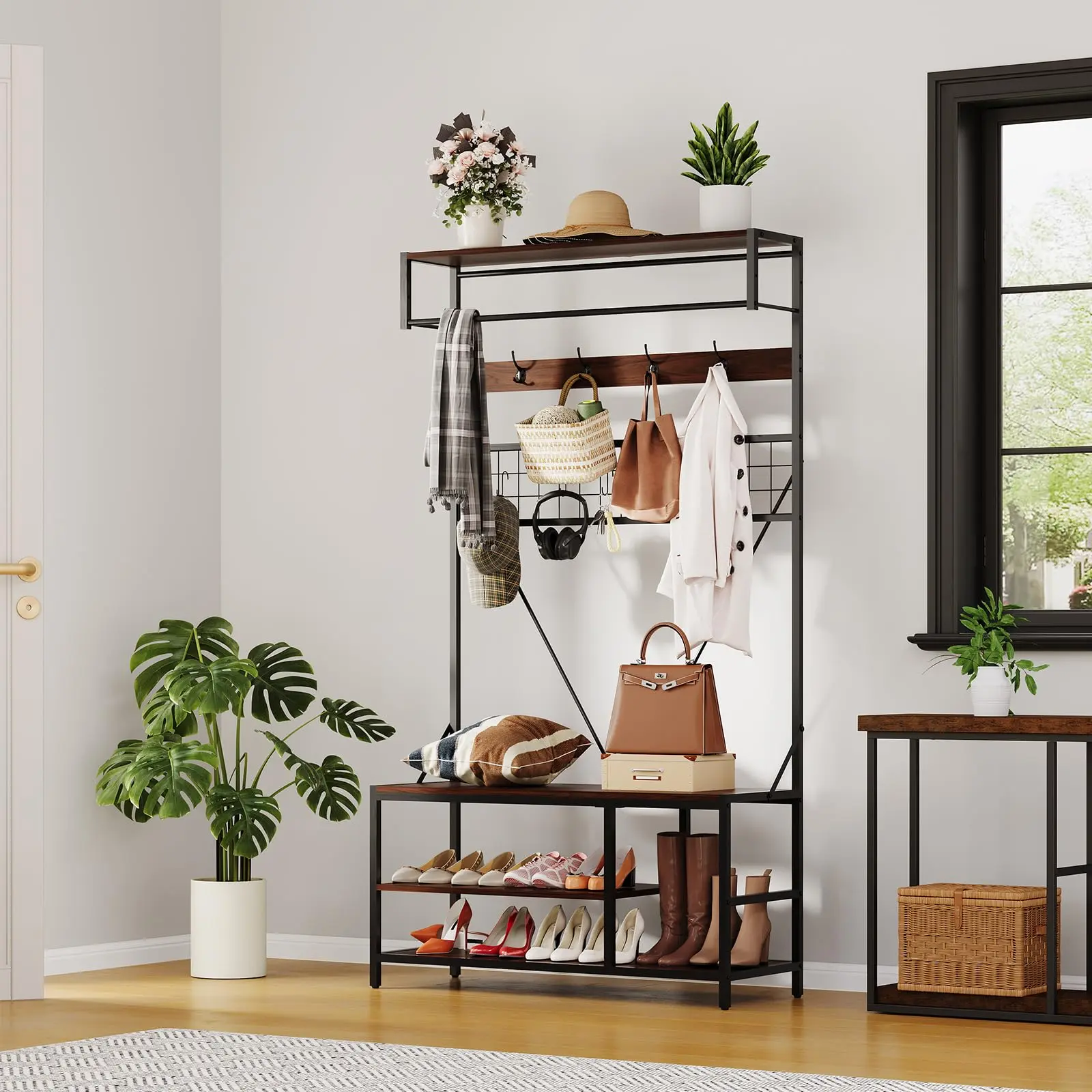 · 【5-in-1 Integrated Design for Total Organization】Simplify your space with this 5-in-1 multifunctional hall tree, your complete entryway organization solution. It conveniently combines a height-adjustable top shelf, a hanging rod, a 9-hook coat rack, a seating bench, and 3 storage shelves to neatly hold coats, shoes, bags, and all your everyday essentials
