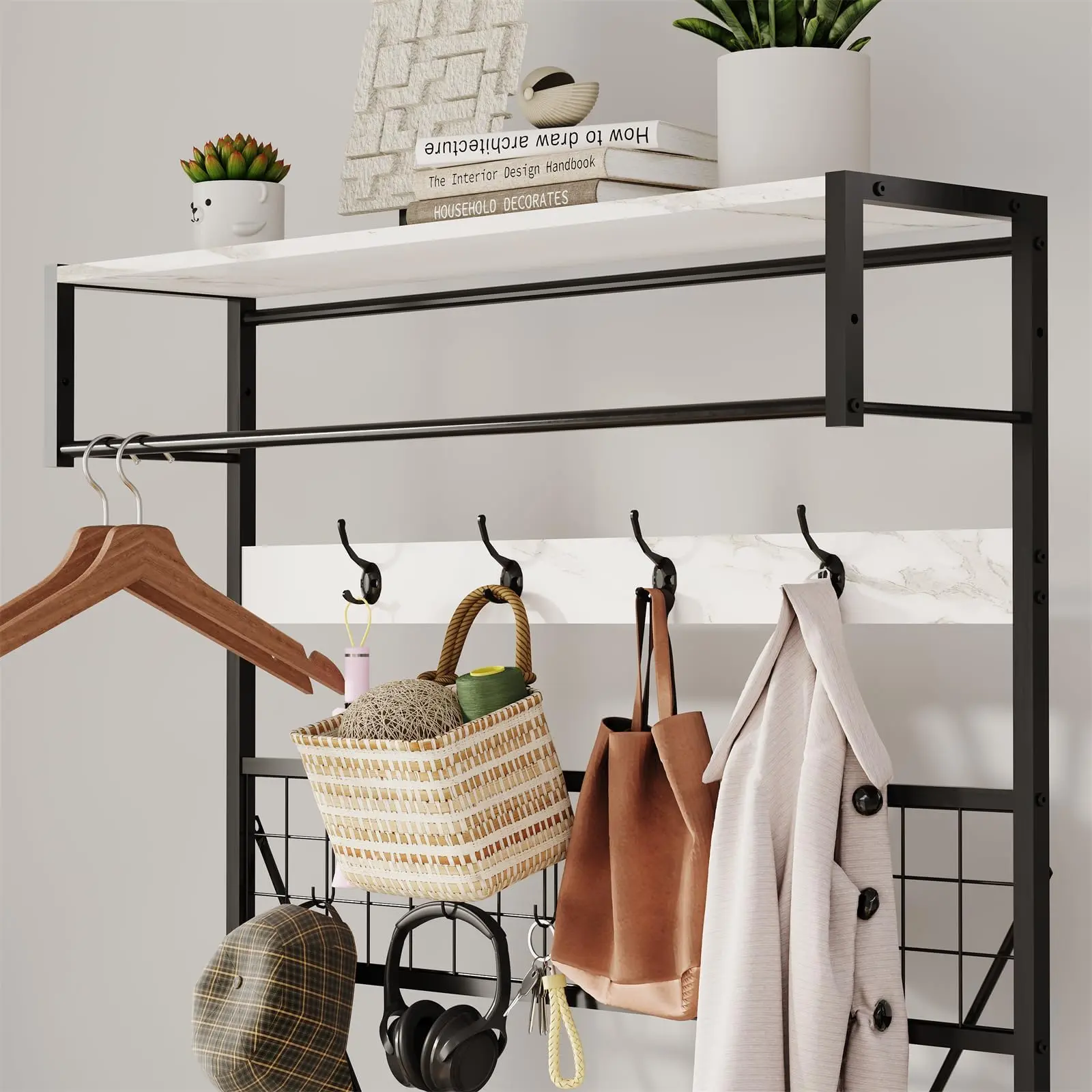 · 【Adjustable Shelf & Practical Hanging Rod】This hall tree smartly combines function and style: the height-adjustable top shelf is perfect for displaying plants, frames, or decor, while the sturdy hanging rod below neatly organizes scarves, umbrellas, and extra clothing, offering both practical storage and decorative appeal