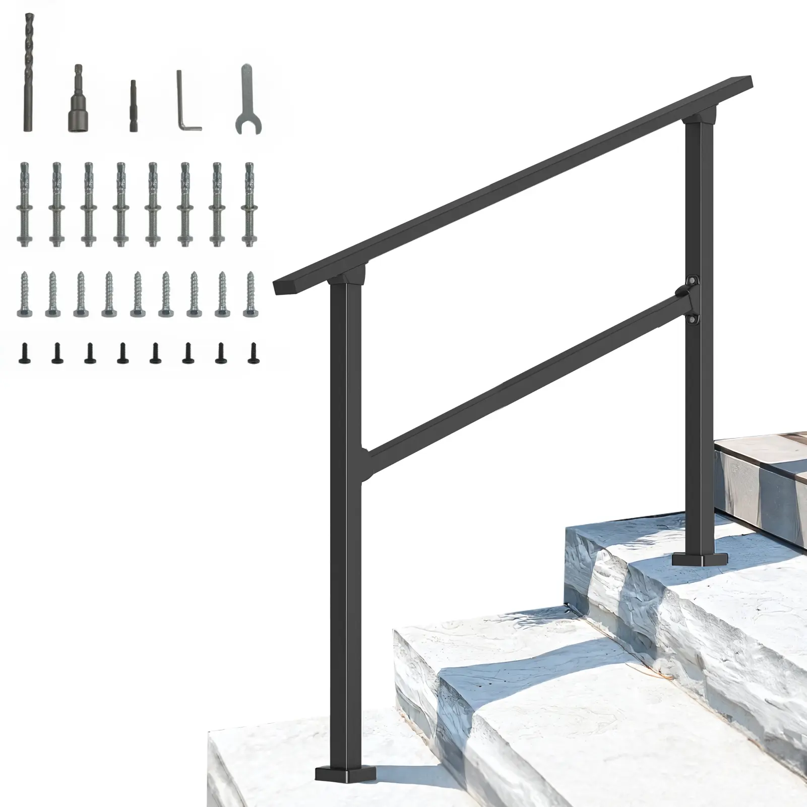 3 Step Handrails: The handrail design meets strict building standards, measuring 40 inches in length and 36 inches in height, with an adjustable angle suitable for 1 to 3 steps. Installation requires drilling but no cutting. The smooth surface on both sides of the handrail provides a comfortable grip and prevents hand injuries, featuring an aesthetically pleasing metal finish that enhances overall stability and safety.