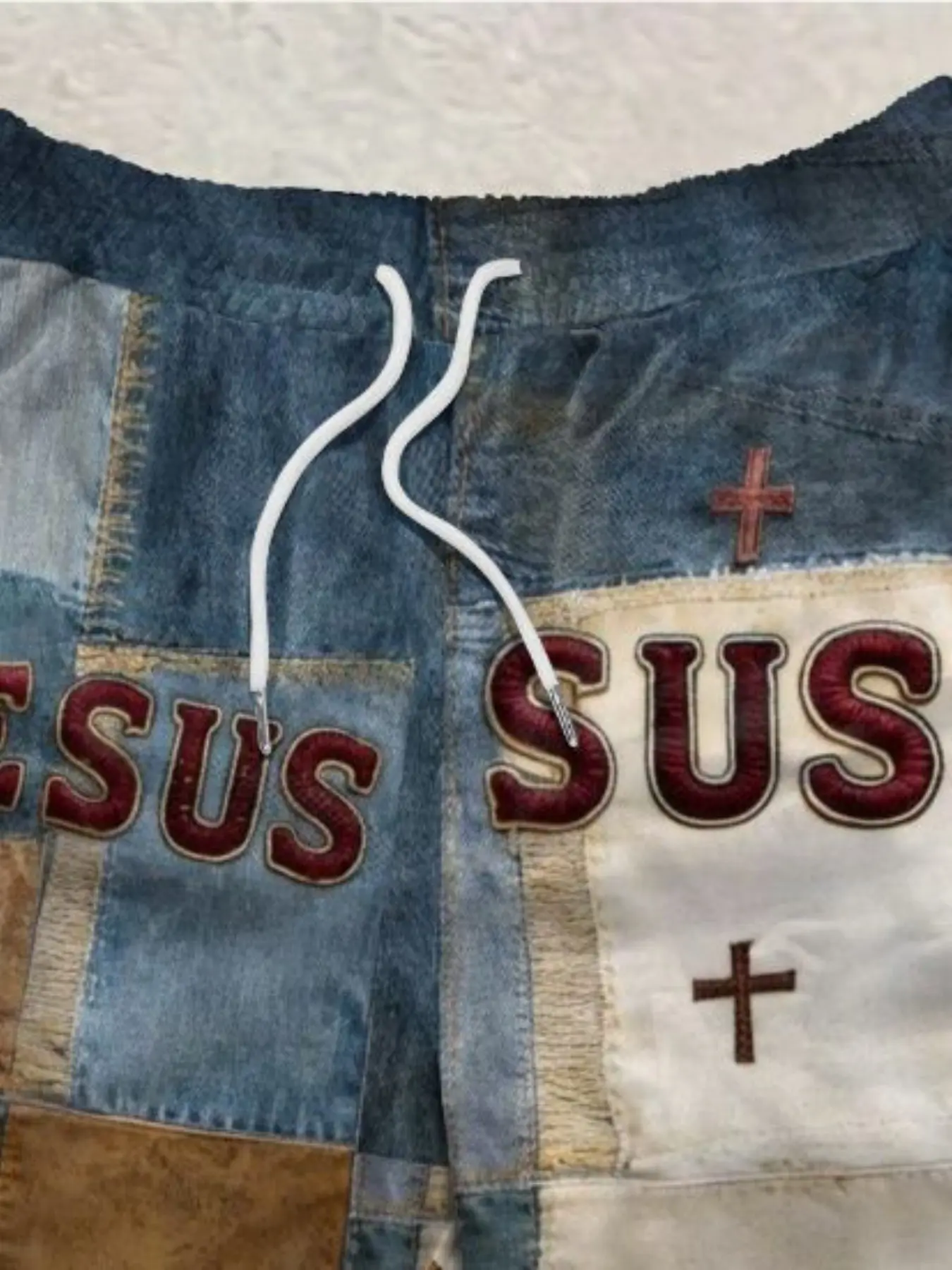 Summer 2-Piece Set for Men, Casual Patchwork T-Shirt & Shorts, Short Sleeve, Above the Knee, All over Print, Perfect for Summer