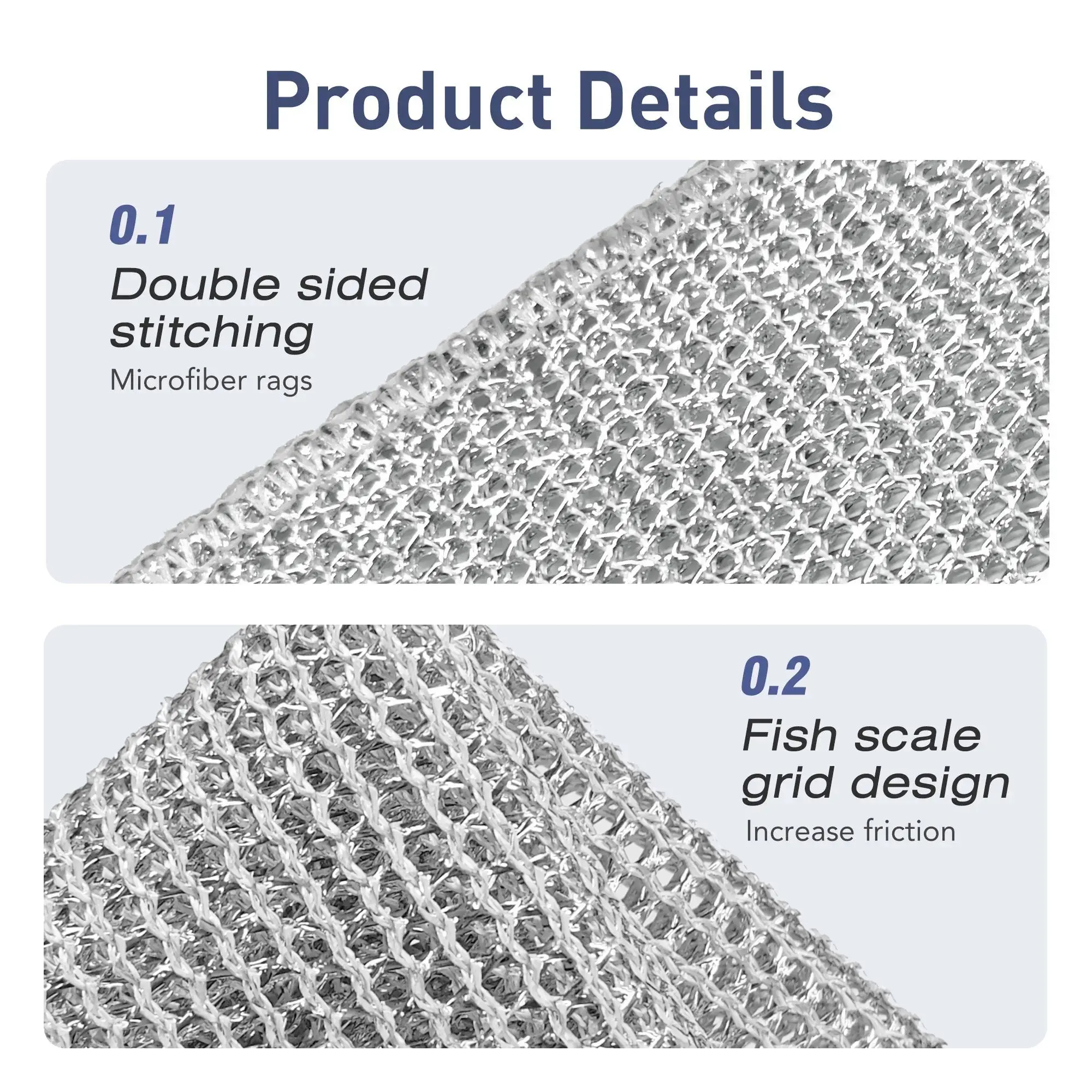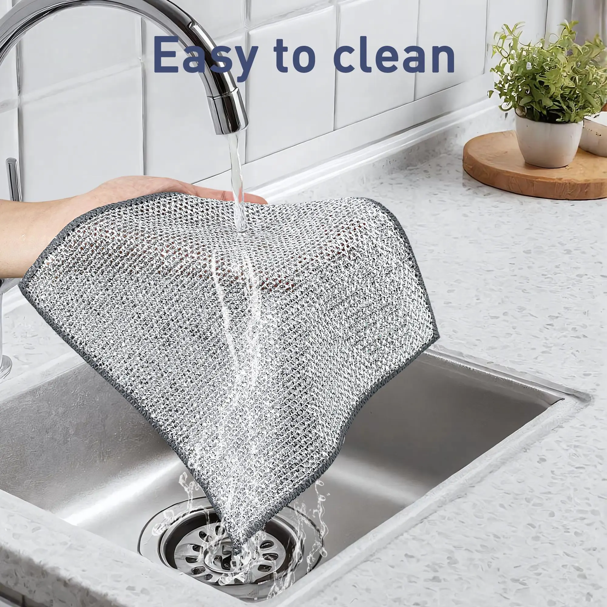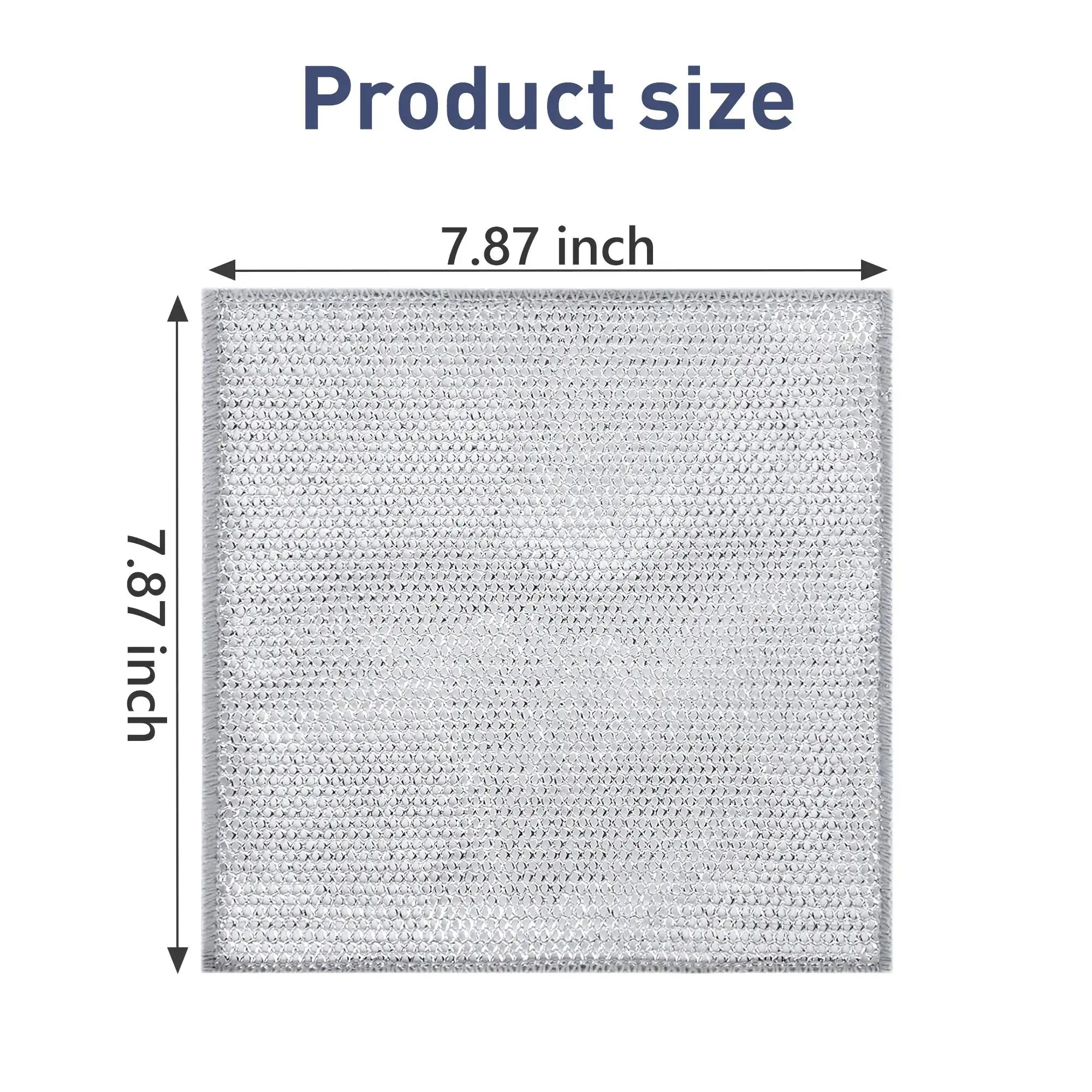 Powerful Cleaning - The metallic cleaning cloth is made of sturdy yet soft wire material, so the wire cleaning cloths can effectively wipe away stubborn stains on dishes, silverware, stovetops, countertops, mirrors and windows, making your home cleaning much easier Non-Scratch - The multifunctional wire dishcloth is safe to use on oven racks, non-stick cookware, stainless steel appliances and other various surfaces without damage. The light and soft dish rags offer super cleaning power, making your kitchen shining and won't scratch delicate surfaces Reusable and Easy Care - These metal wash cloths feature mesh manufacturing process and precise stitching for long-lasting, and unbreakable even after repeated use. Rinsing with mild detergent after use, it will dry quickly and won't get smelly Multiple Uses - The dish scrubber can use for kitchen, bathroom and other household cleaning tasks. The light but sturdy structure offer strong cleaning power for outdoor or indoor use Practical Size - The double-layer dish washing scrubbers measures 7.87˝ x 7.87˝, are suitable for easy handling and thorough cleaning, making it to be a good helper for home cleaning