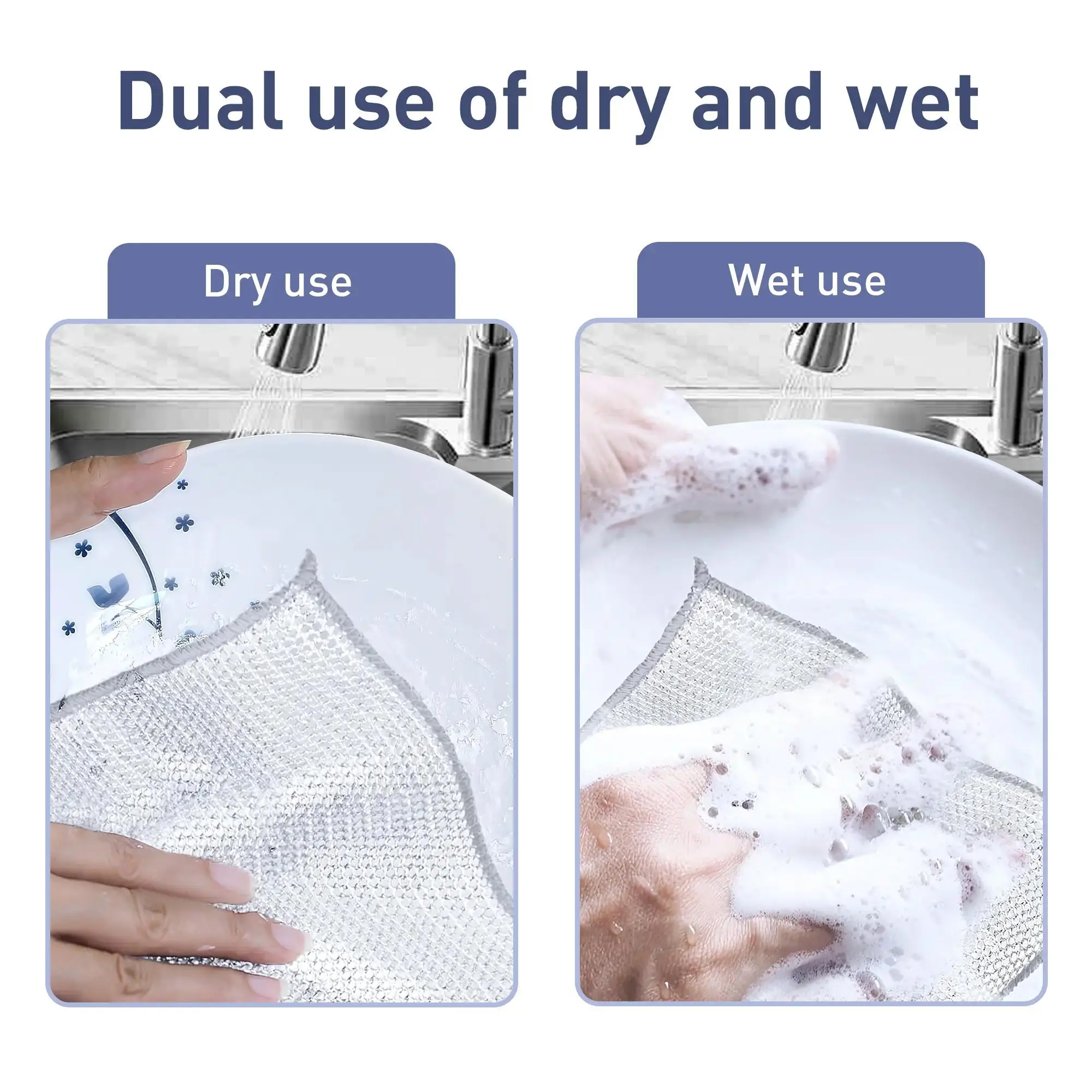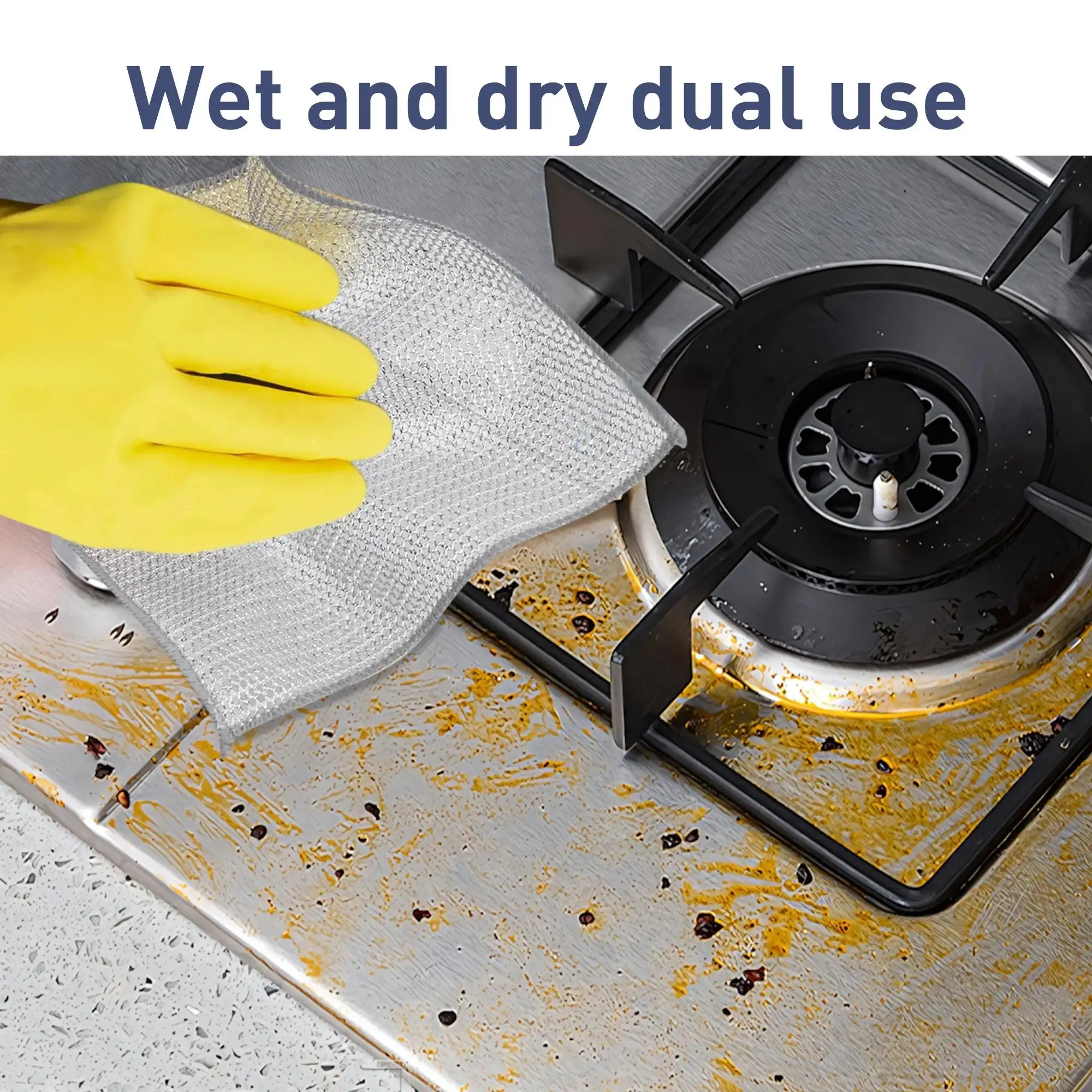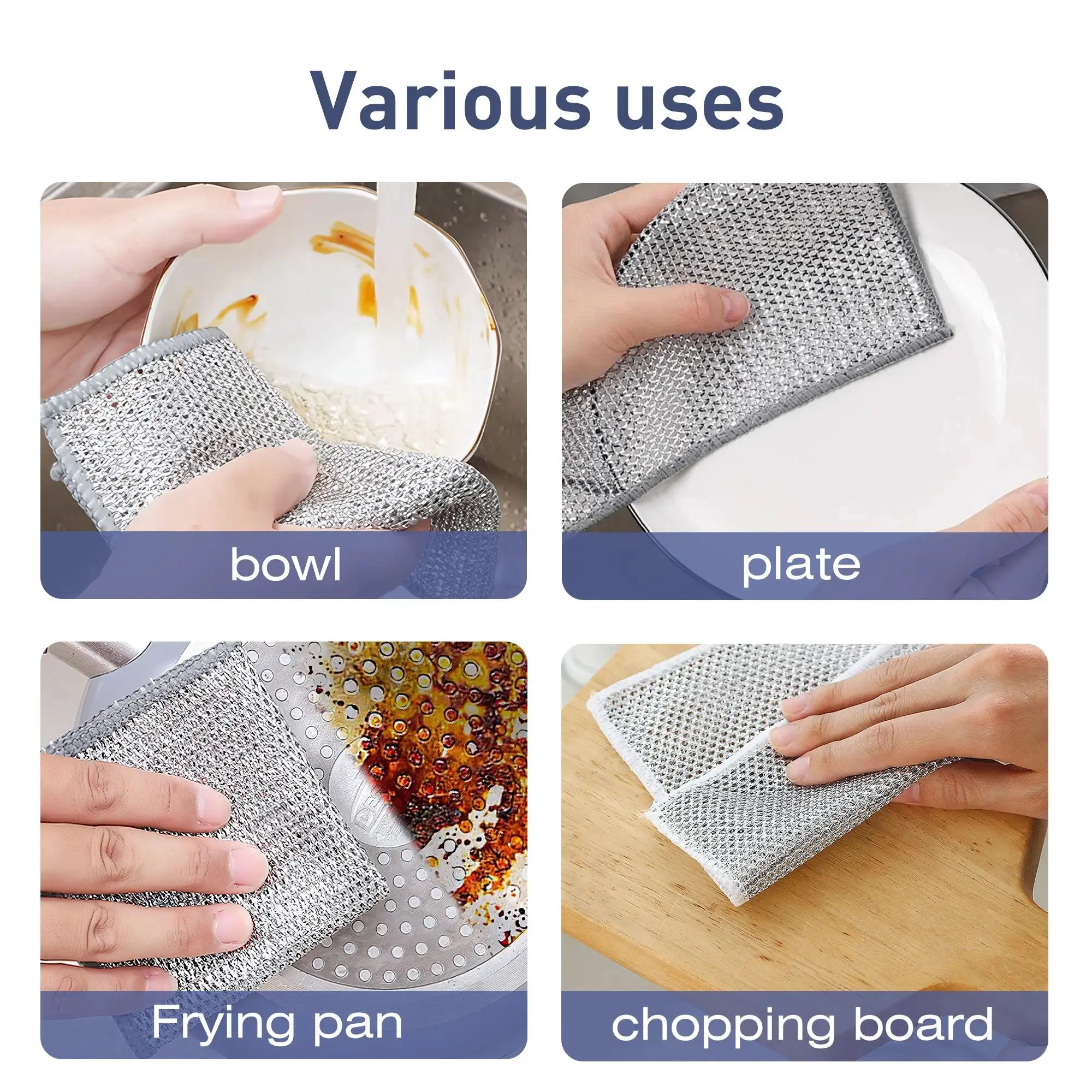 Powerful Cleaning - The metallic cleaning cloth is made of sturdy yet soft wire material, so the wire cleaning cloths can effectively wipe away stubborn stains on dishes, silverware, stovetops, countertops, mirrors and windows, making your home cleaning much easier Non-Scratch - The multifunctional wire dishcloth is safe to use on oven racks, non-stick cookware, stainless steel appliances and other various surfaces without damage. The light and soft dish rags offer super cleaning power, making your kitchen shining and won't scratch delicate surfaces Reusable and Easy Care - These metal wash cloths feature mesh manufacturing process and precise stitching for long-lasting, and unbreakable even after repeated use. Rinsing with mild detergent after use, it will dry quickly and won't get smelly Multiple Uses - The dish scrubber can use for kitchen, bathroom and other household cleaning tasks. The light but sturdy structure offer strong cleaning power for outdoor or indoor use Practical Size - The double-layer dish washing scrubbers measures 7.87˝ x 7.87˝, are suitable for easy handling and thorough cleaning, making it to be a good helper for home cleaning