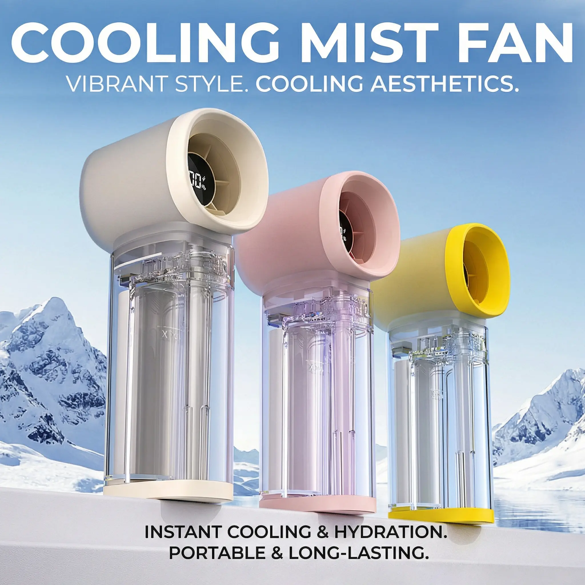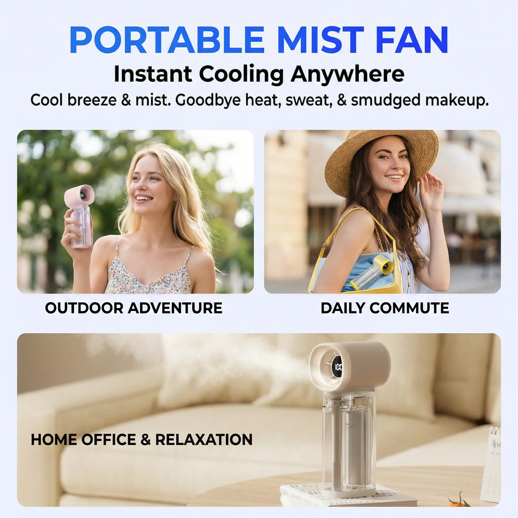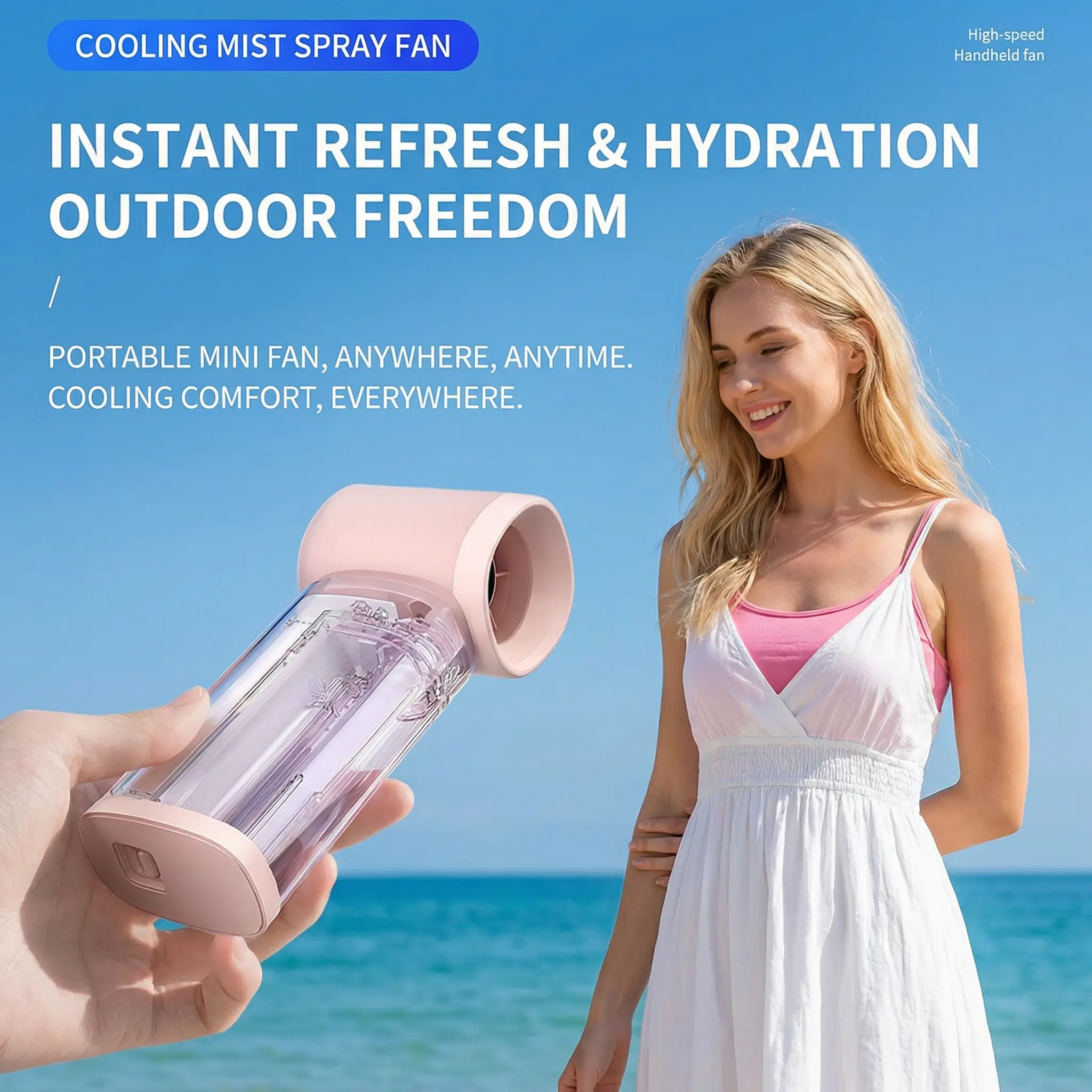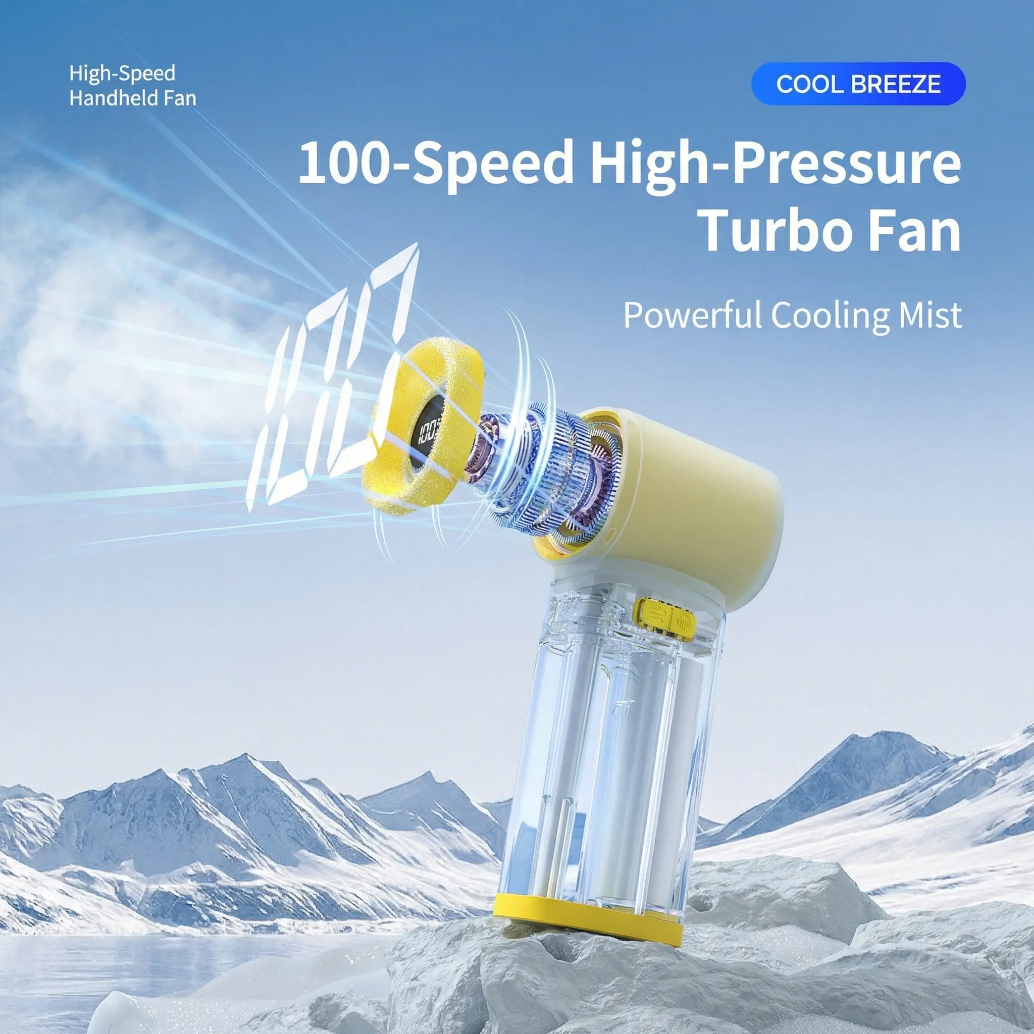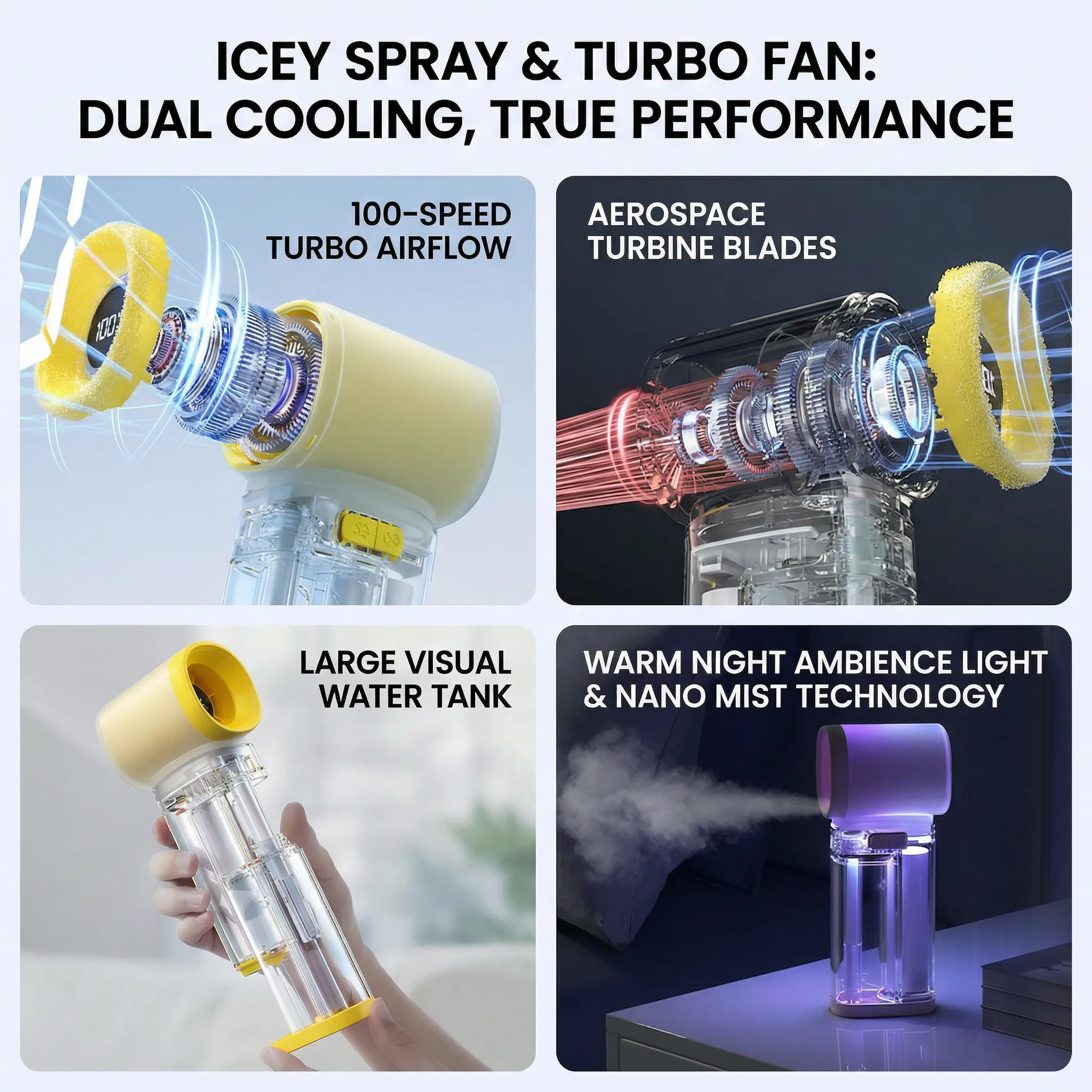 Mini AC Nano Ice Mist Fan, 200-Speed Turbo Airflow, Ultrasonic Atomization, Pop-up Water Tank, Aerospace Turbine Blades, Large Visual Water Tank, Type-C Fast Charging, Long-Lasting Battery, Warm Ambient Light, Portable Handheld Cooling Fan.