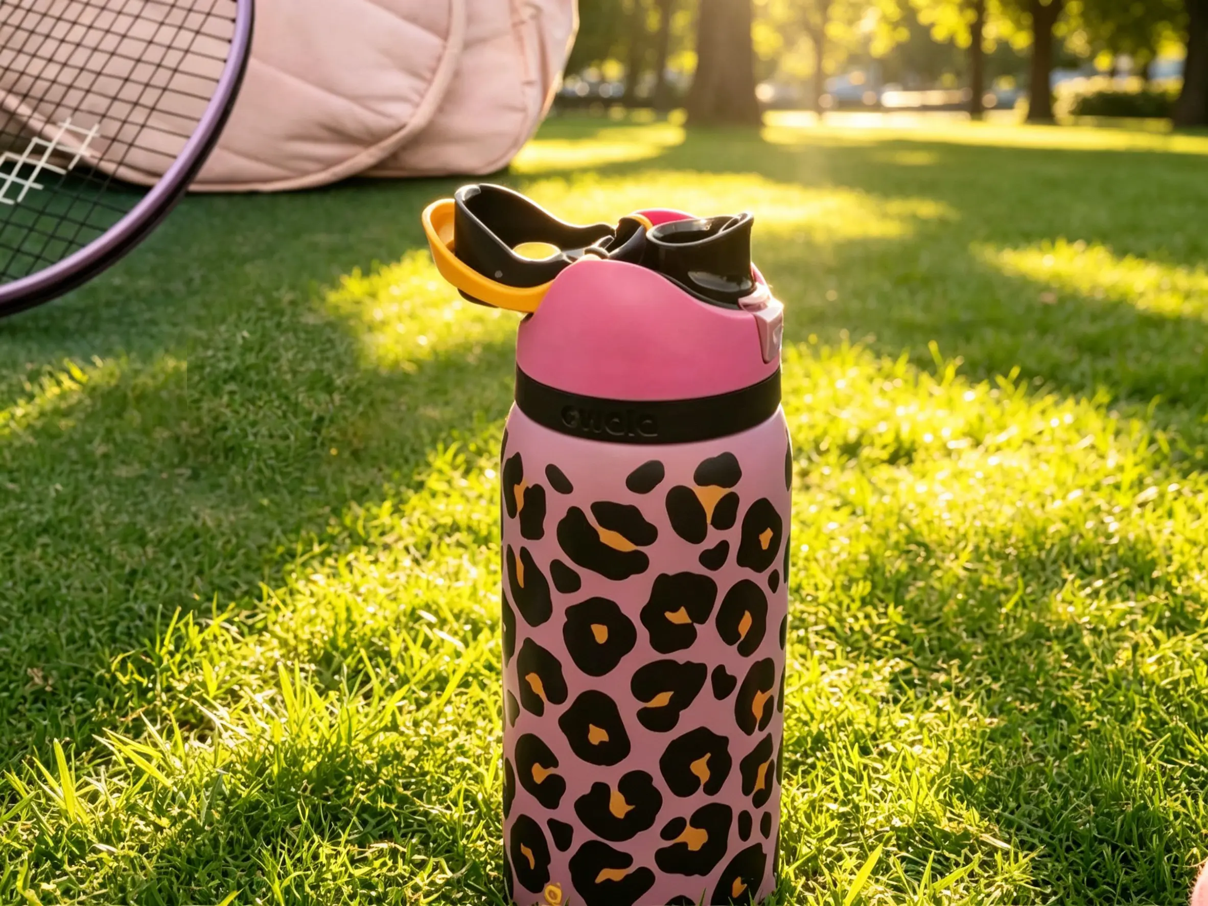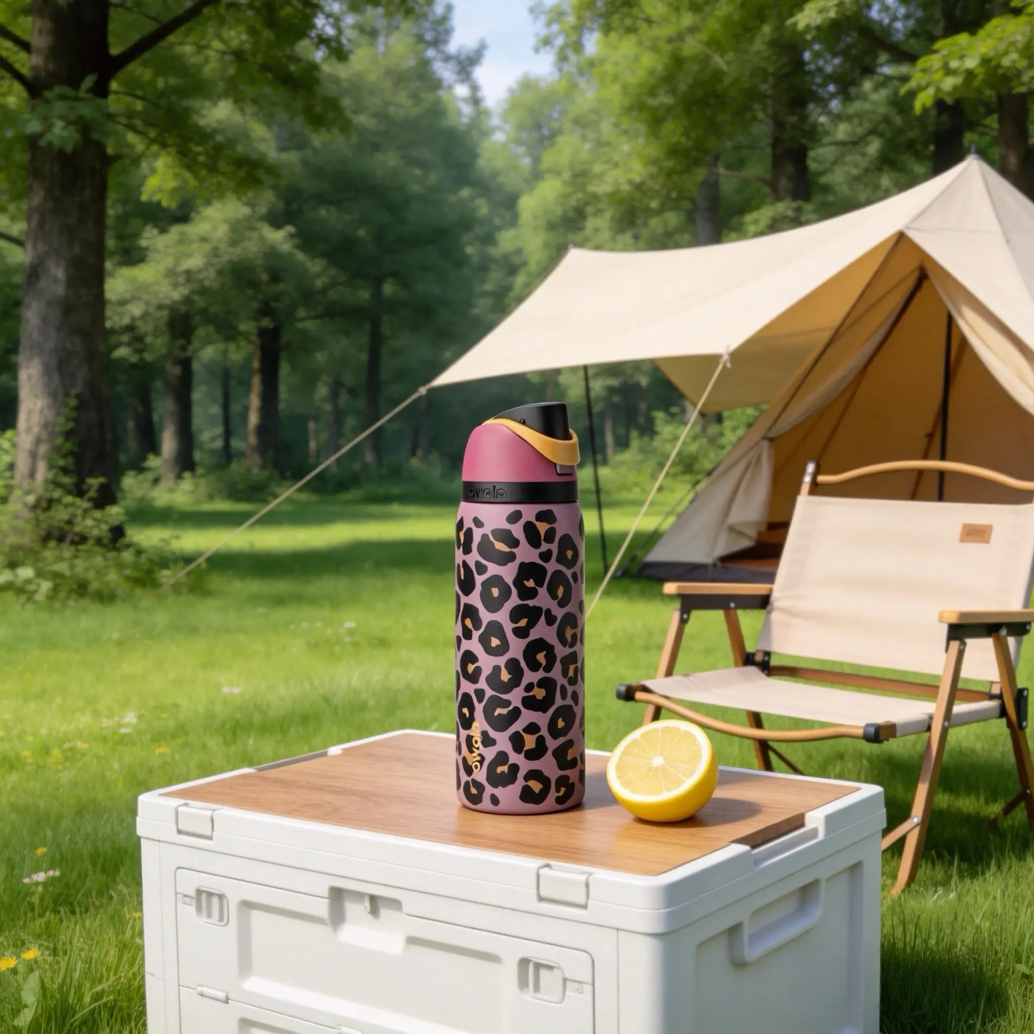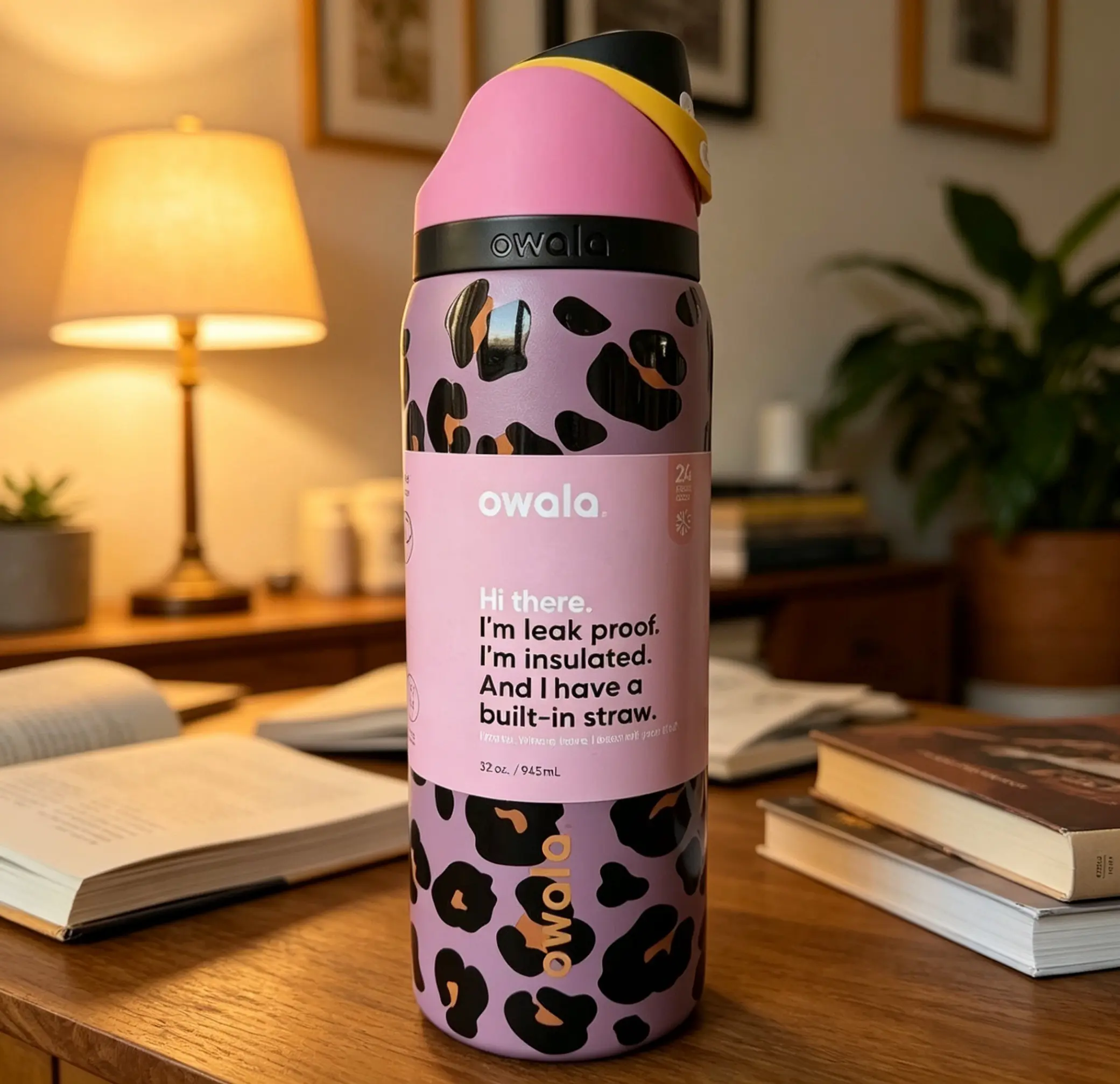 The bottle features a playful leopard print design. It's a portable option for all your hydration needs. Stay hydrated on the go with Owala!