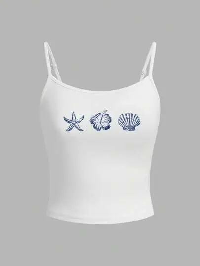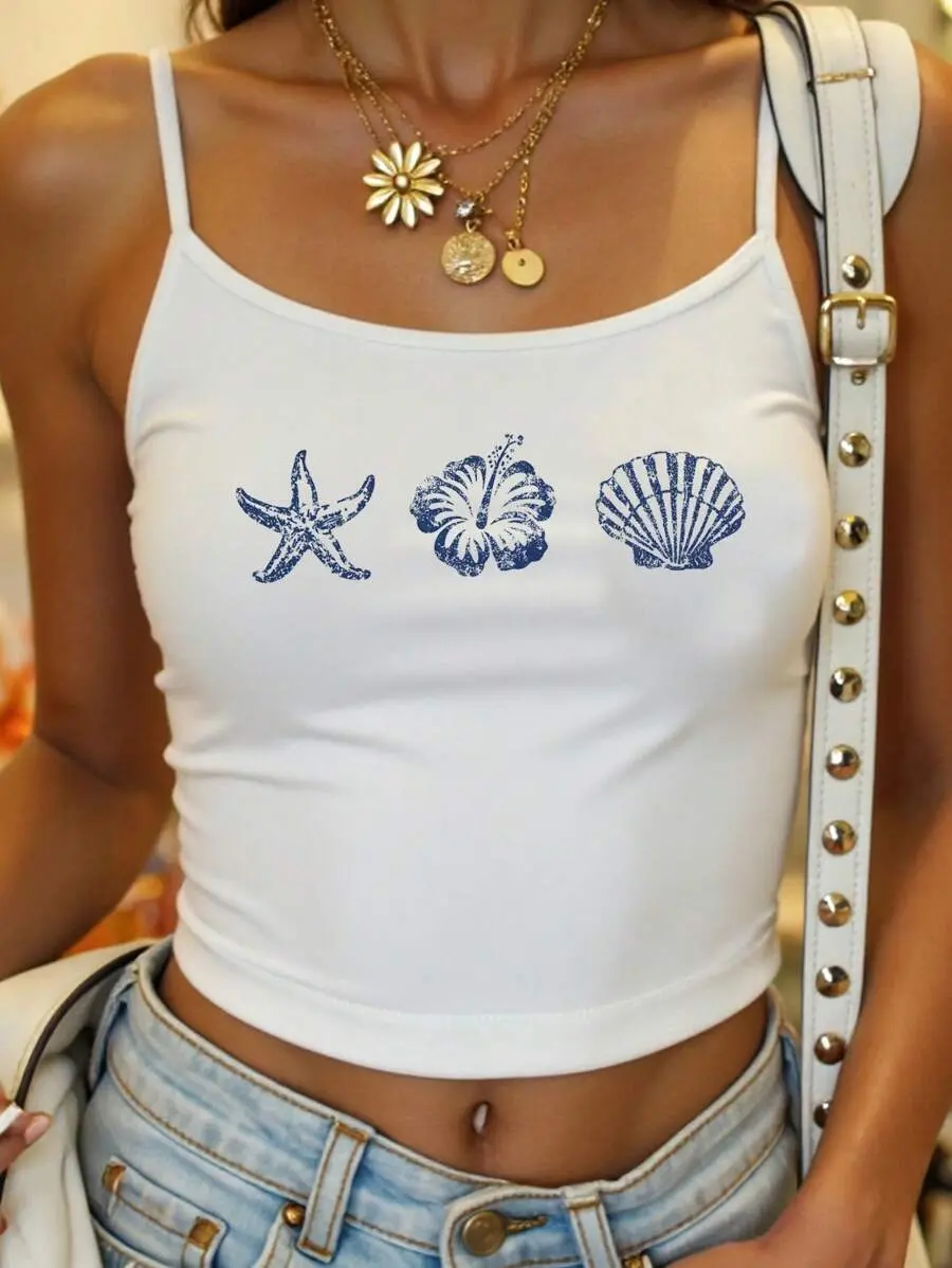 SOLEMN Women's White Casual Sexy Camisole Tank Top Suitable For Summer, With Starfish, Hibiscus, Shell Print,Springbreak,Coconutgirl,Girl Trip,Music Festival Back To School