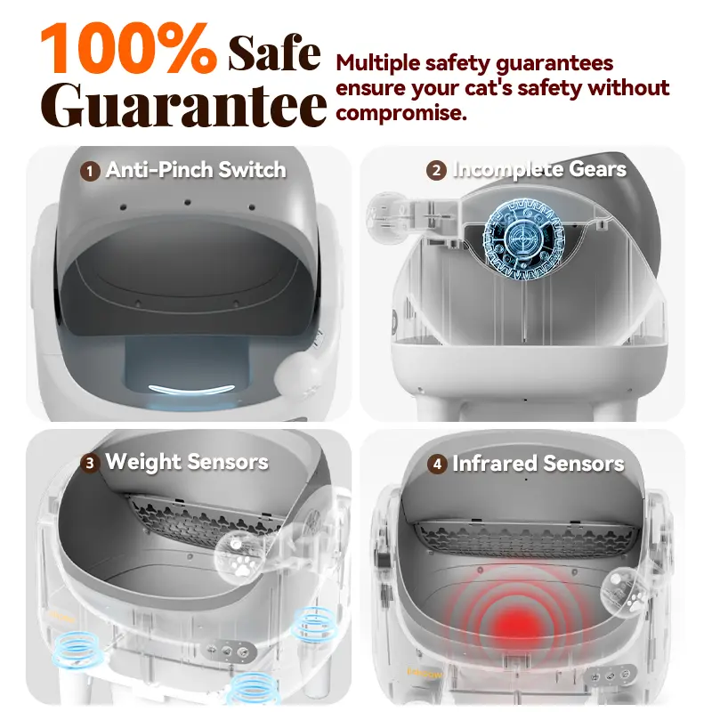 Multi-layer safety guarantees: Anti-Pinch Switch, Incomplete Gear Protection, Weight Sensors + Infrared Sensors. Your cat is safe during every use—no accidents, no worries. 🛡️