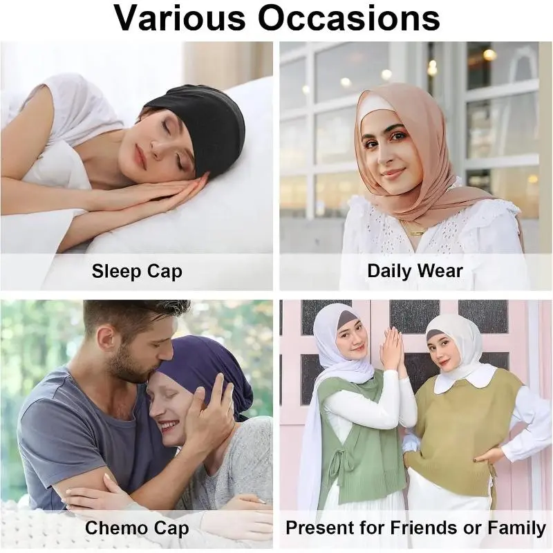 HIJAB UNDERCAP SET: You will receive 4 pieces women hijab undercap in 4 different colors. The different colors and enough quantity can meet your daily use and replacement, the diverse underscarf hijab caps are great for matching your outfit and head scarf. HIGH QUALITY MATERIAL: These hijab undercaps are made of modal, which is very soft, comfortable, breathable, flexible, lightweight and skin friendly. This comfortable material will give you a good wearing experience and allows you to use these hijab cap for a long time. ONE SIZE FITS MOST: The underscarf hijab cap measures about 9.4 x 7.5 inches/ 24 x 19cm, one size fits most. The undercap is adjustable since it has a tie-back that you can loosen or tighten them to your liking. These under scarf for women hijab cap can cover all of your hair, they could stay in place throughout the day, won't slip backwards under your scarf. EASY TO WEAR: It's easy to use the inner caps, you can hold your hair together, put it in the hijab cap and tie two strings to fix it, which can stay for a long time and will bring you great convenience. WIDE OCCASIONS: This Under cap for hajib is suitable for various occasions in daily life, you can wear the undercap for work, going out, shopping, outdoor activities, parties, trip, cooking, sleeping, yoga, gym and so on, making your life more convenient.