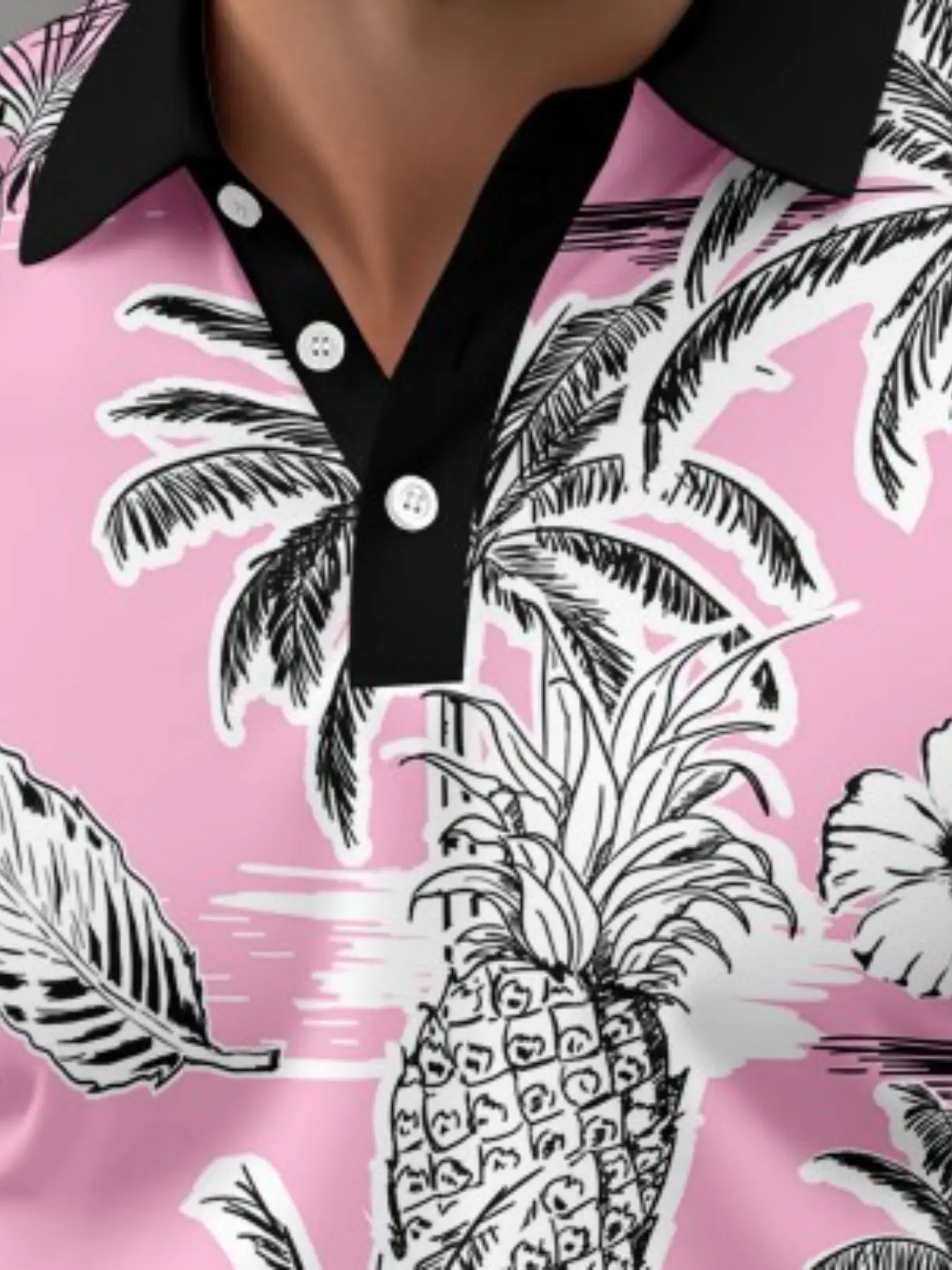 Men's Summer Tropical Pineapple Banana Palm Tree Print Polo Shirt, Casual Short Sleeve Golf Shirt, Breathable Lightweight Hawaiian Beachwear