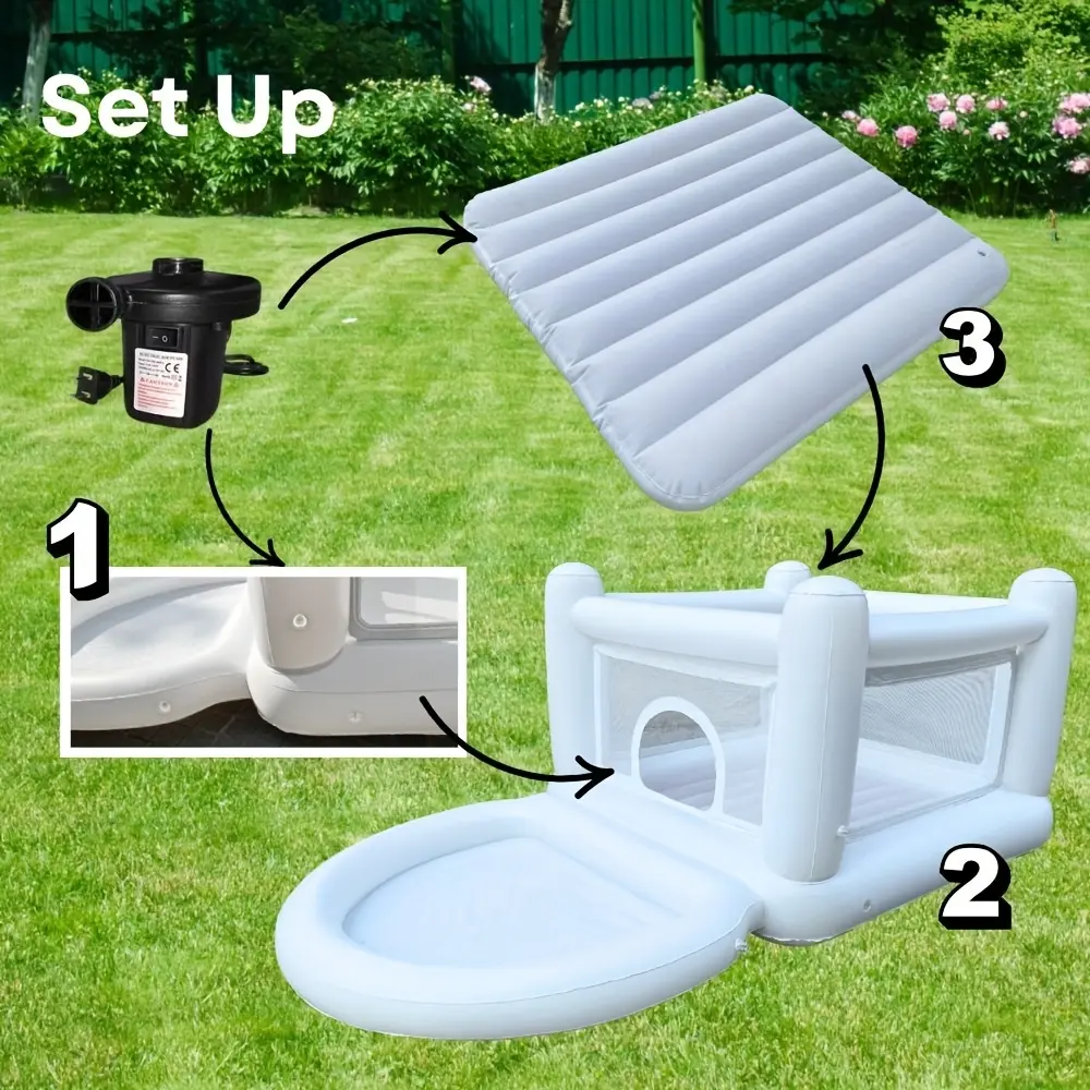 Simple Installation Steps: Place the gray side of the inflatable cushion upward, inflate it to 70% first, insert it into the bounce house and continue inflating until fully fitted with no gaps