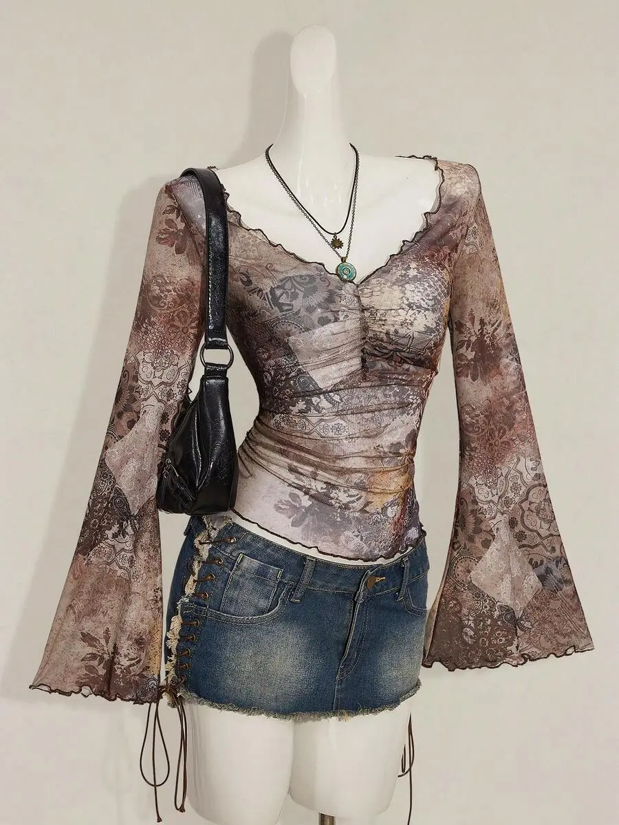 SOLEMN Fall Women's Western Boho Teal Allover Print V-Neck Ruched Elegant Long Sleeve Blouse
