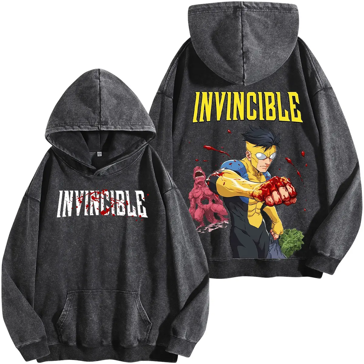 Mark Grayson Invincible Superhero Washed Hoodie Comic Graphic Tee Vintage Washed Unisex T Shirt Streetwear Action Hero Design Retro Comic Style Gift for Superhero Fans