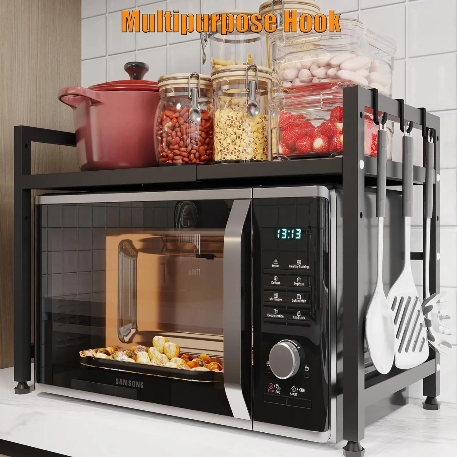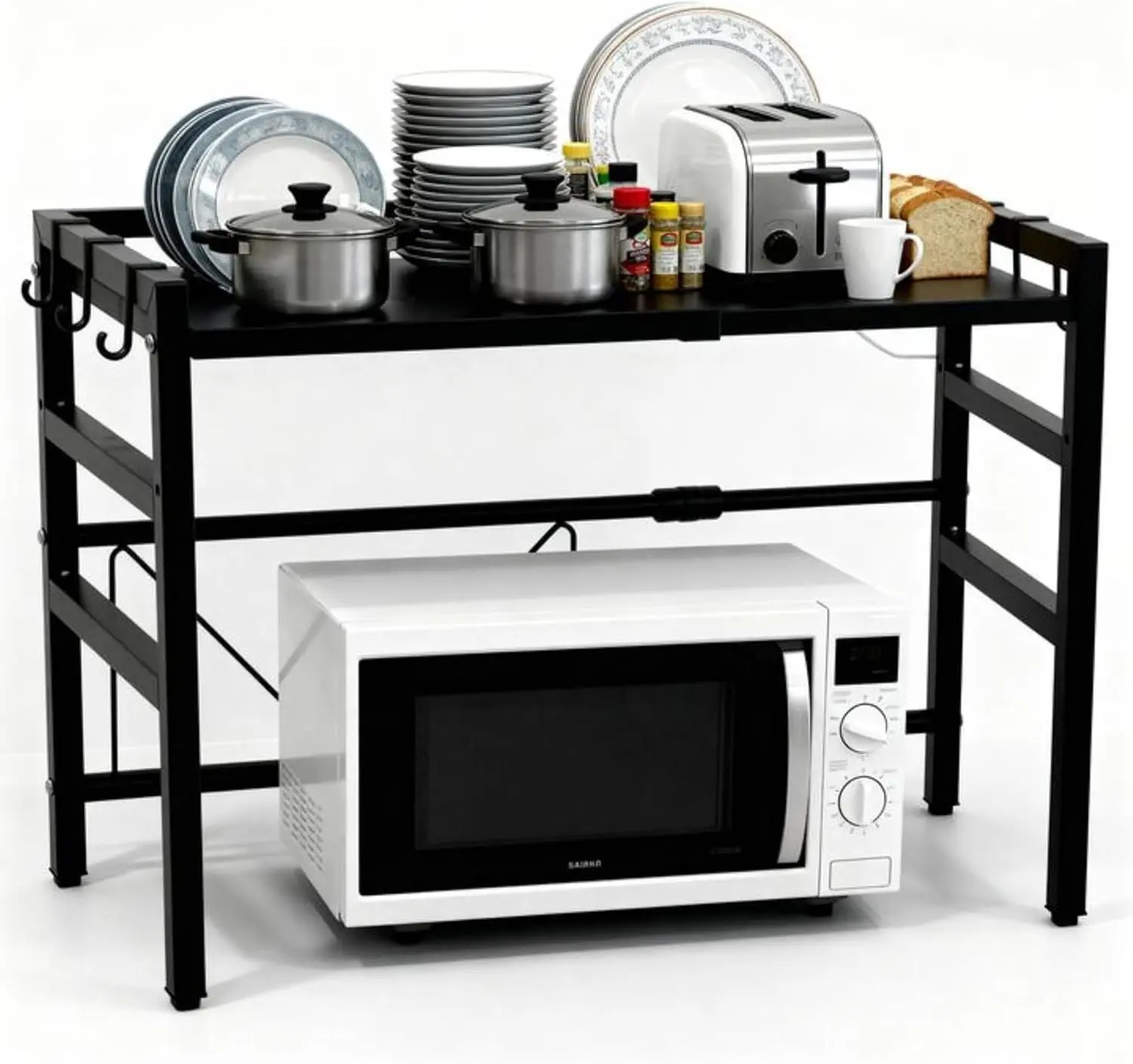 This shelf conveniently stores microwaves, stoves, toasters, coffee machines, and more. It keeps your kitchen clean and tidy. Versatile enough for use in kitchens, shower rooms, closets, or garages. Includes hooks for storing dishes or towels, adding to its functionality.