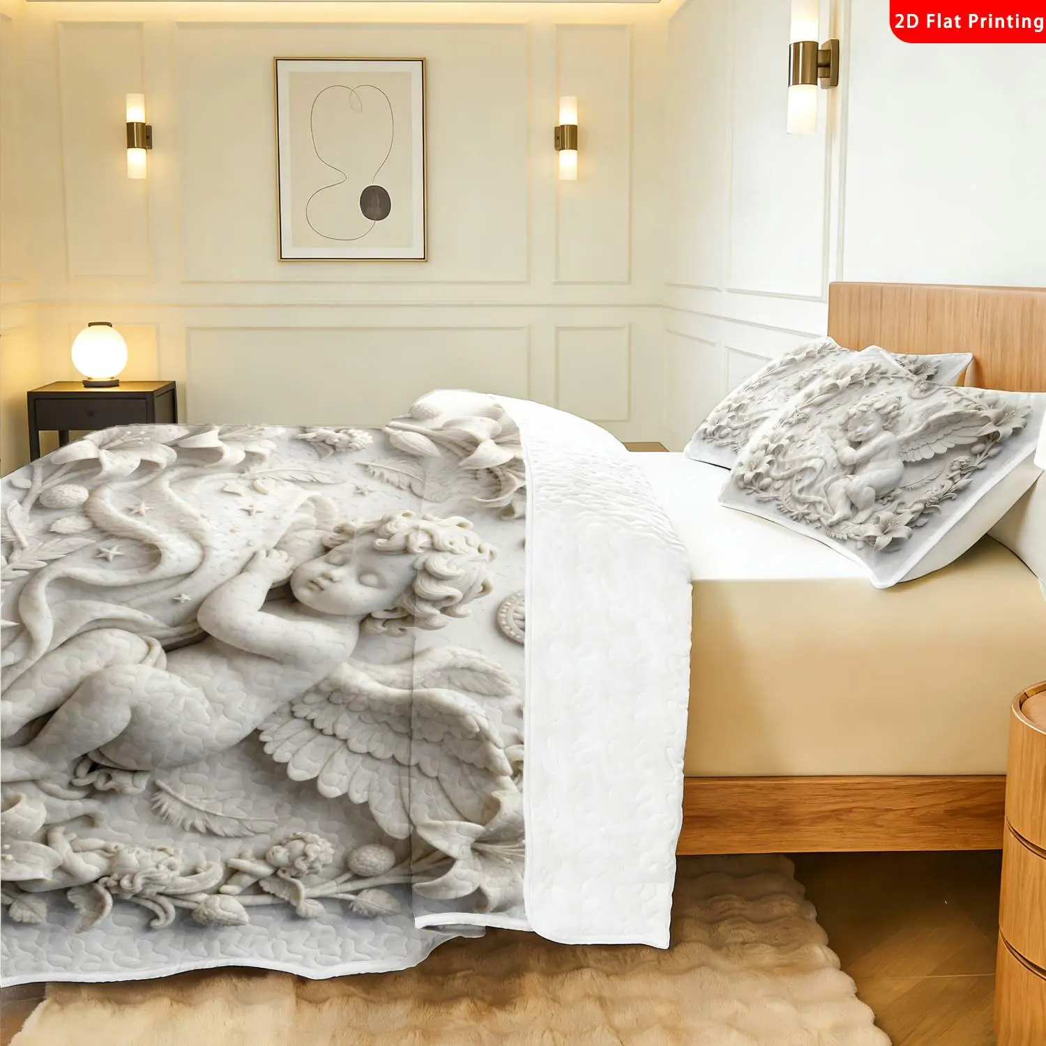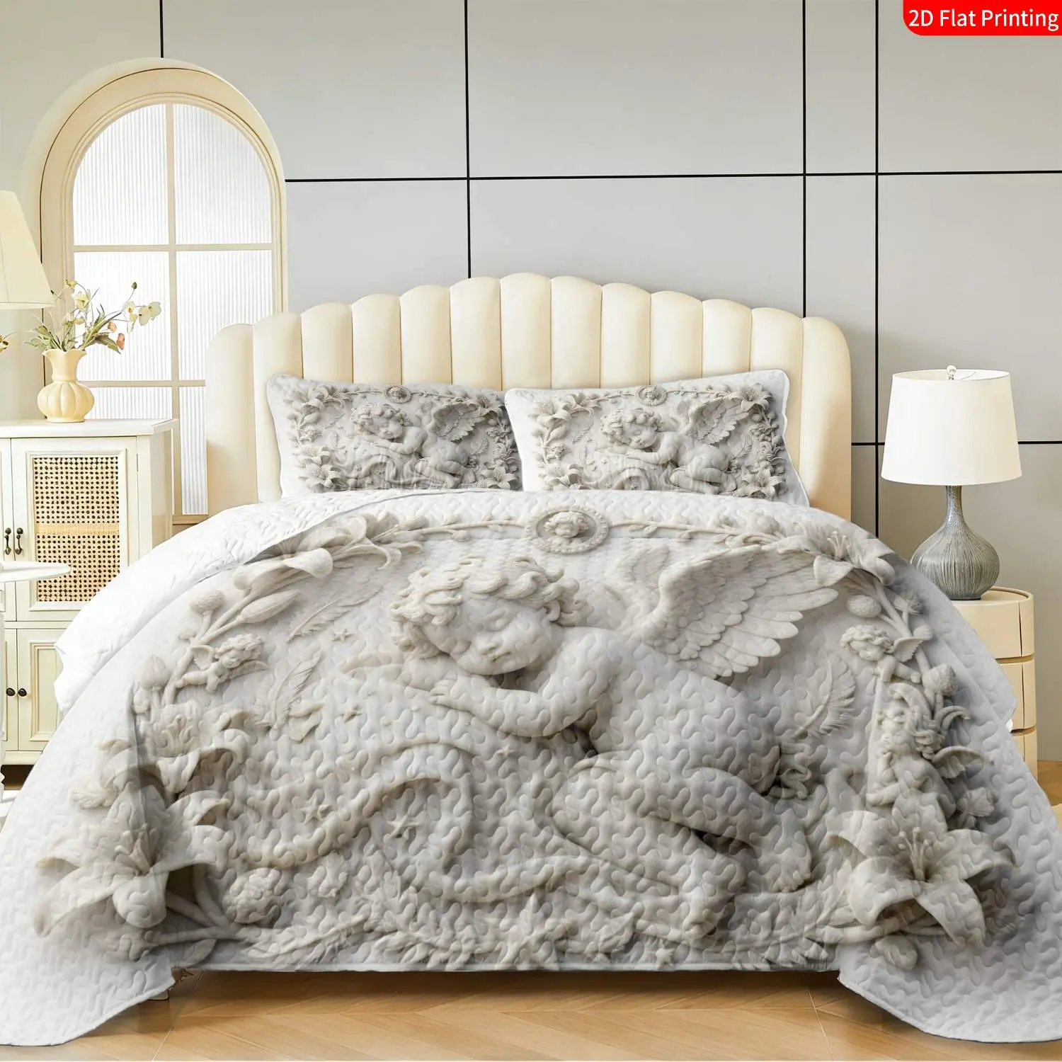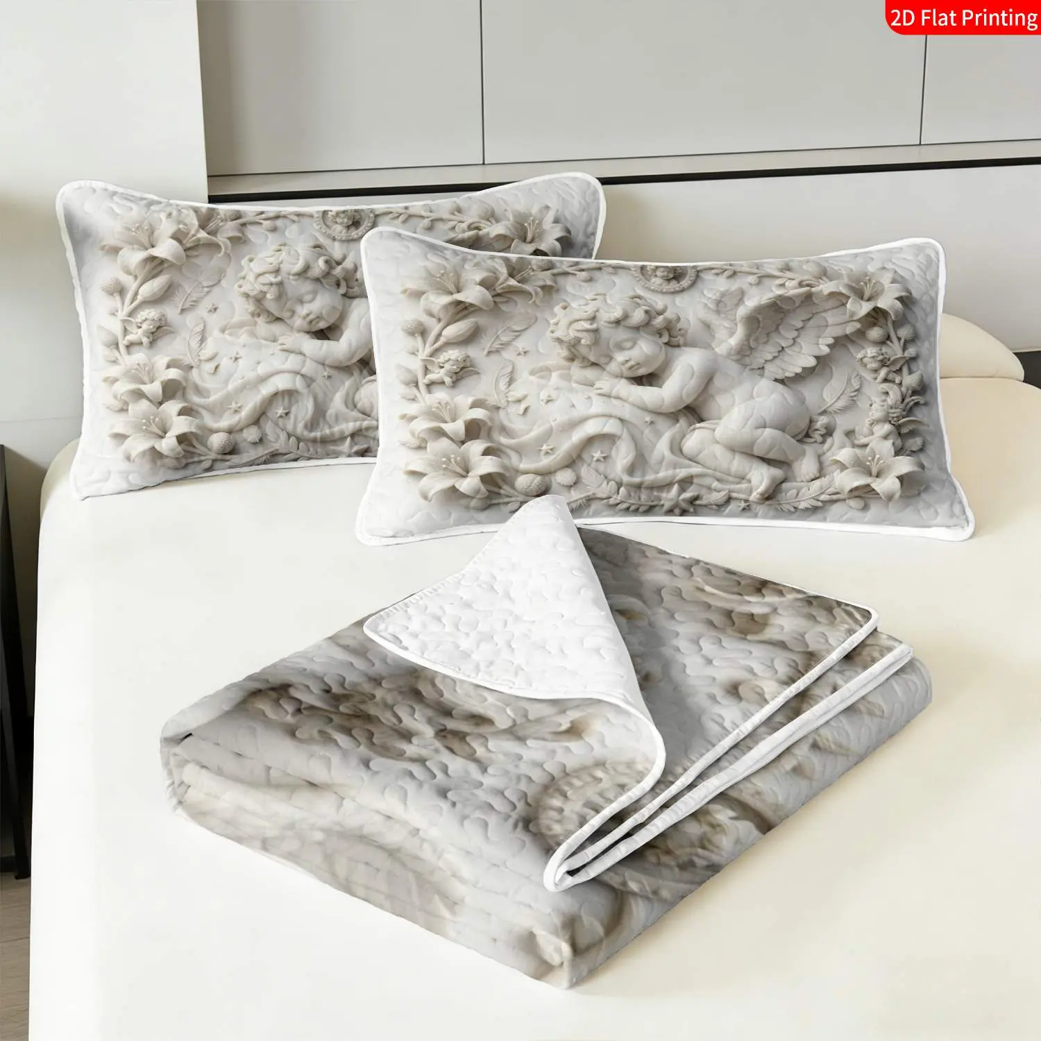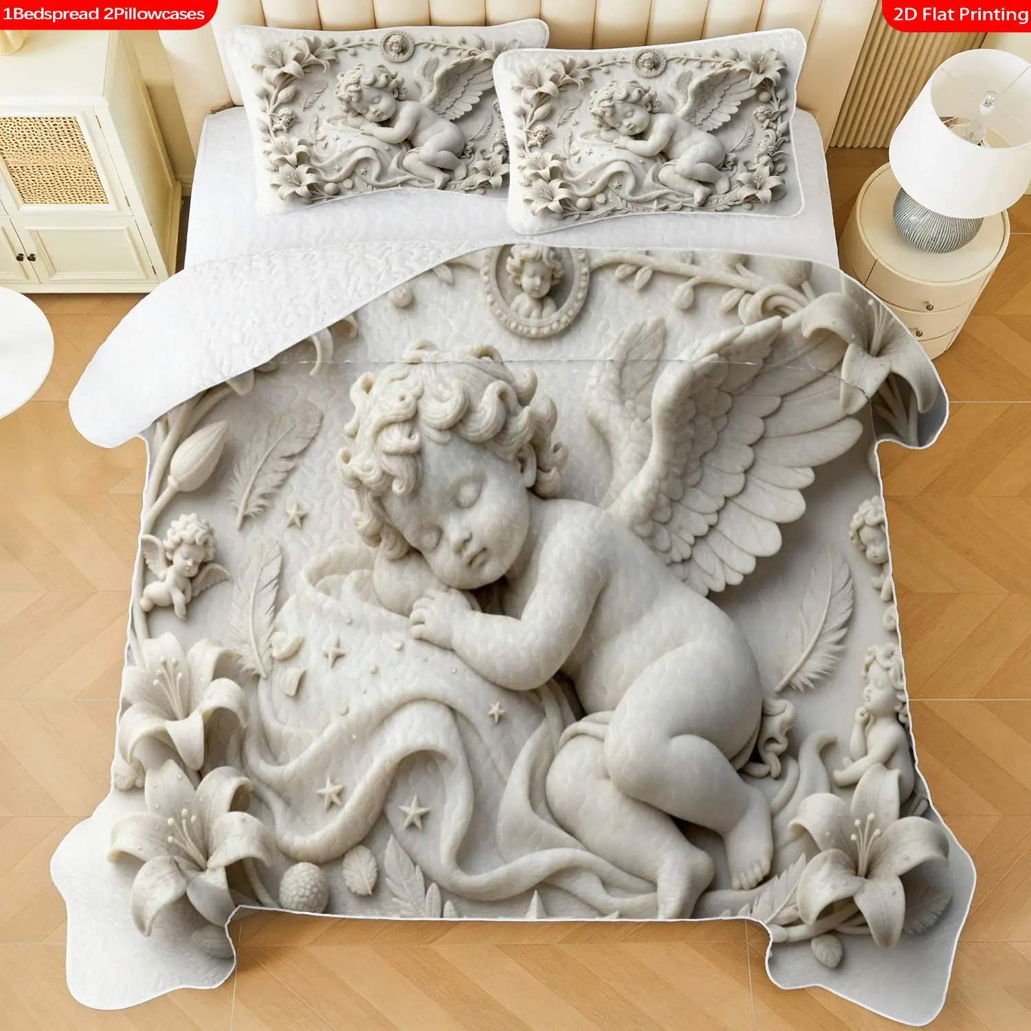 3 pcs, 2D flat print Angelic Relief Art bed cover set, Cherub & Floral Theme, multiple sizes available, bedding set, festive decorative bedding, ideal for bedroom decor(1 bedspread , 2 pillowcases)