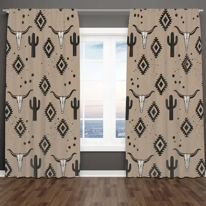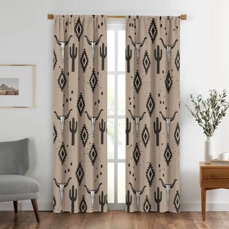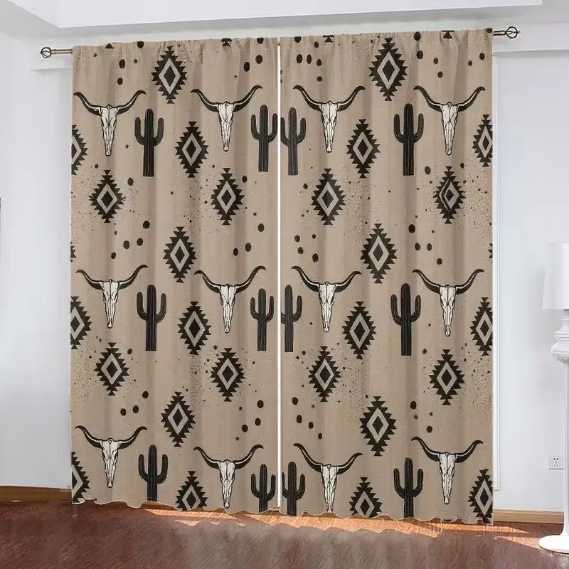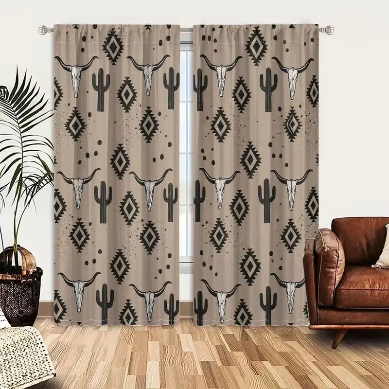 2 pieces of high-definition digital southwestern style ox skull, cactus, and geometric pattern printed curtains. Made of polyester, semi-transparent material, machine washable, suitable for bedrooms, living rooms, and home decoration curtains.