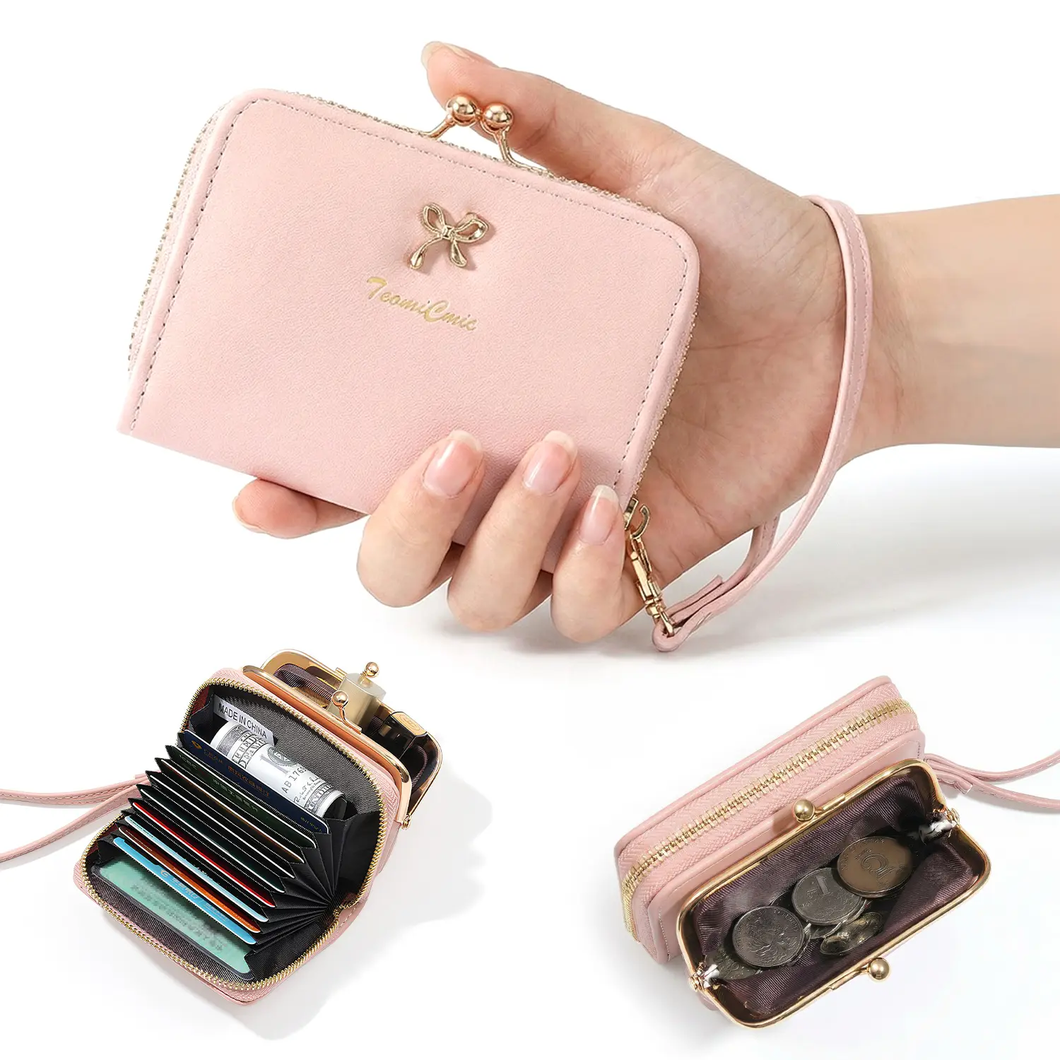 Zipper Mini Wallet Wrist Strap Bow, Card & Coin, Travel Friendly