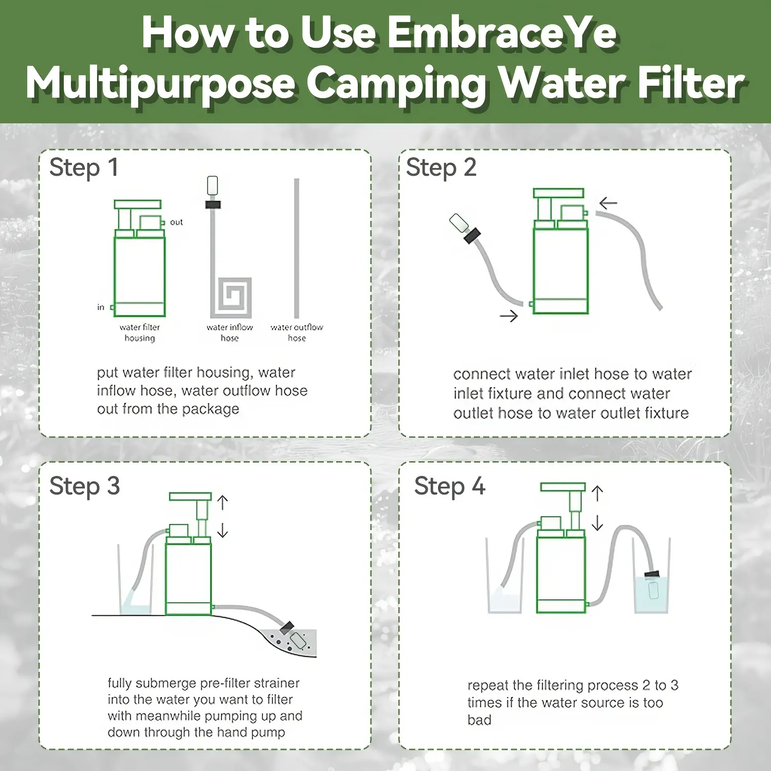 ·Water Filter Backpacking - An easy pack-and-go water filter. No need to charge or wait for clean water with this hiking water filter. Comes with a cup, bag, filters, tubes, and instruction manual.