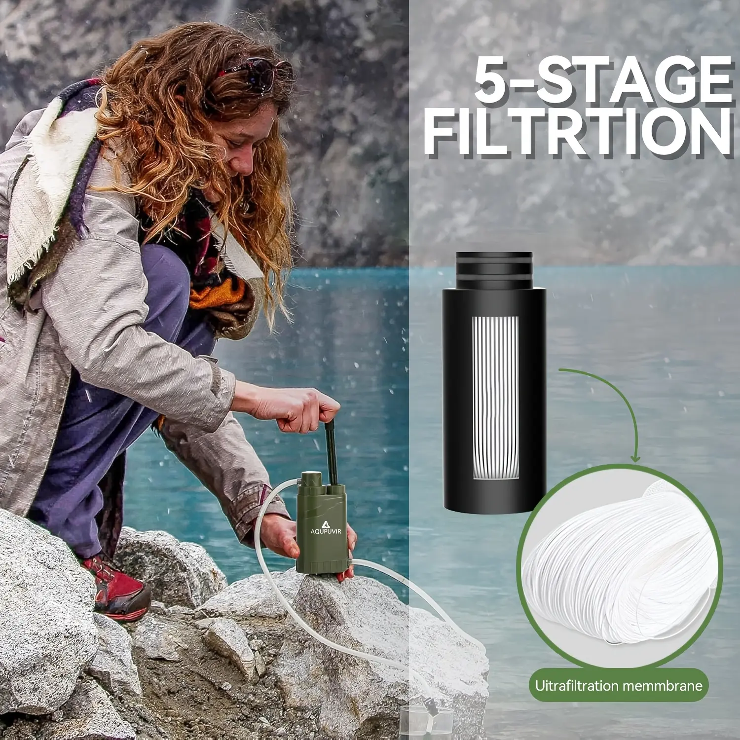 AQUPUVIR Portable Water Filtration Pump Outdoor Survival Gear, 0.01 Micron Replaceable Carbon Filter 4-Stage Purification, Food-Grade ABS Lightweight for Camping Hiking Backpacking Emergency EDC, Ideal Gift for Father’s Day Easter
