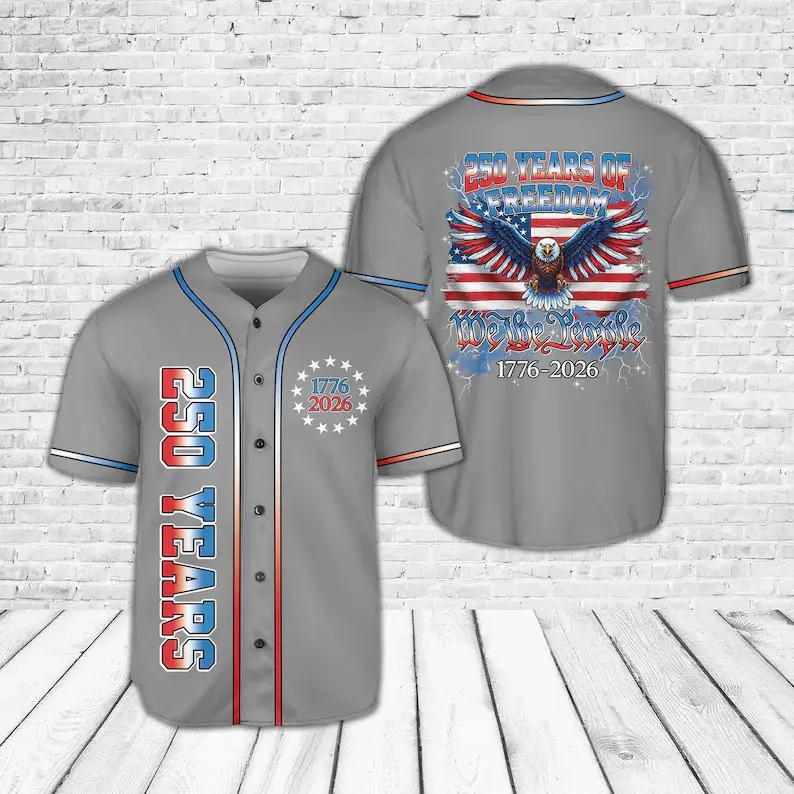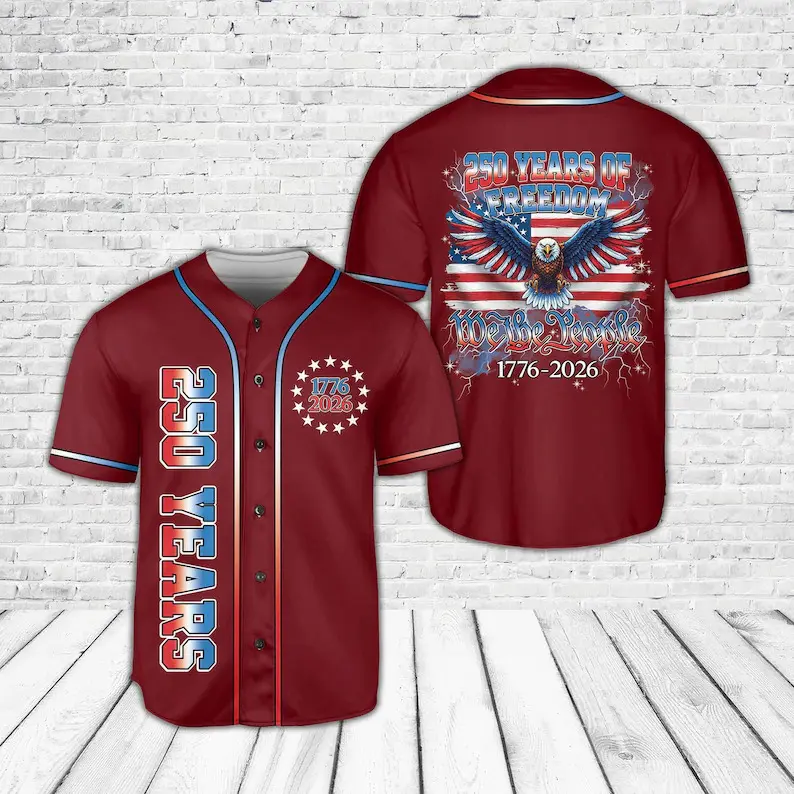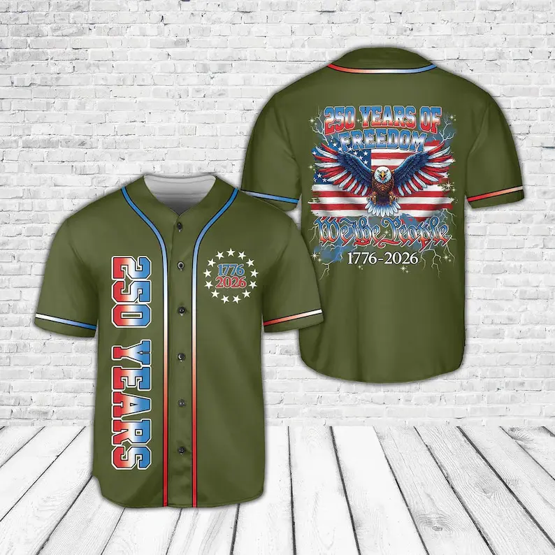 Patriotic 250 Years baseball jersey. America 250th Anniversary 1776–2026 design with bald eagle & US flag. Ideal 4th of July gift. Multiple colors available.