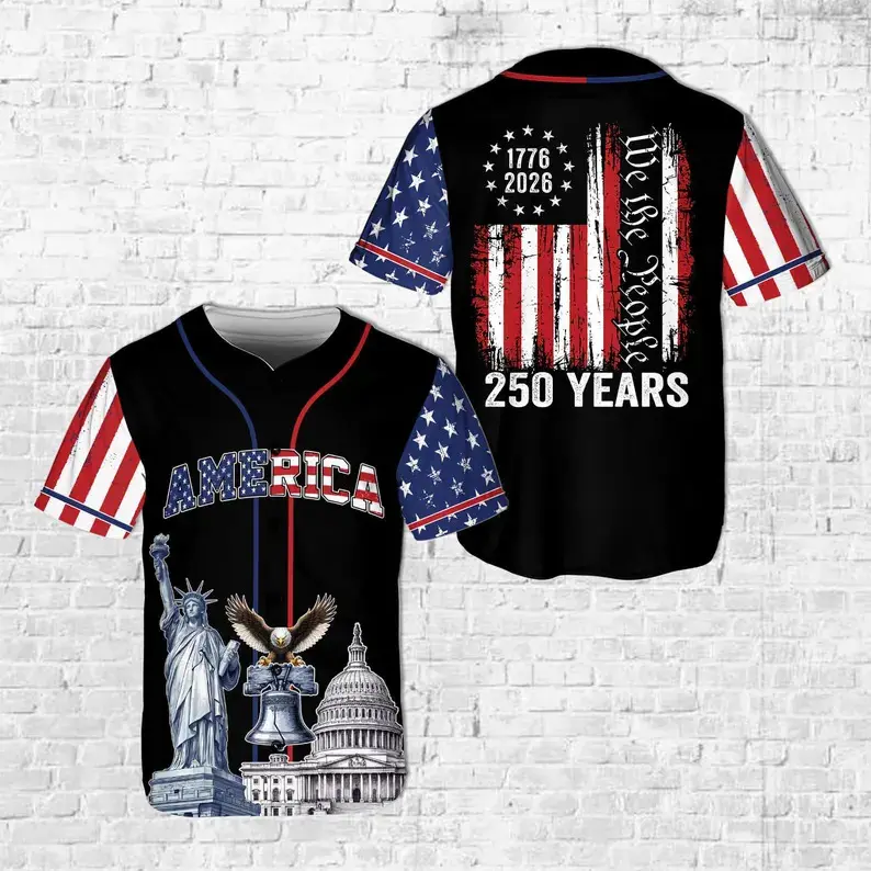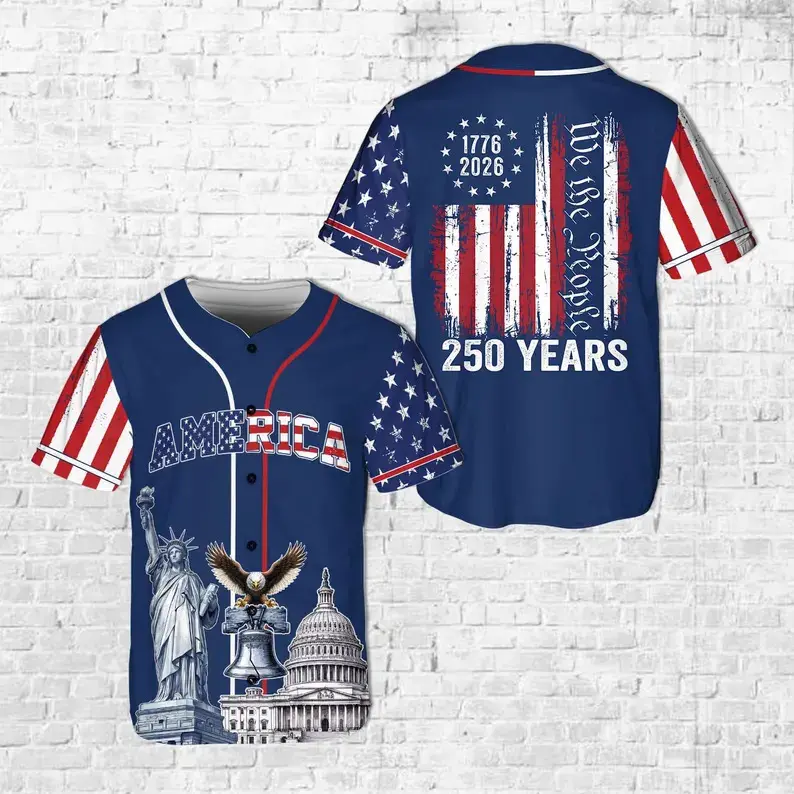 Unisex America 250th Anniversary 1776–2026 baseball jersey. Features We The People, patriotic eagle and Statue of Liberty. Great Independence Day gift. Multiple colors available.