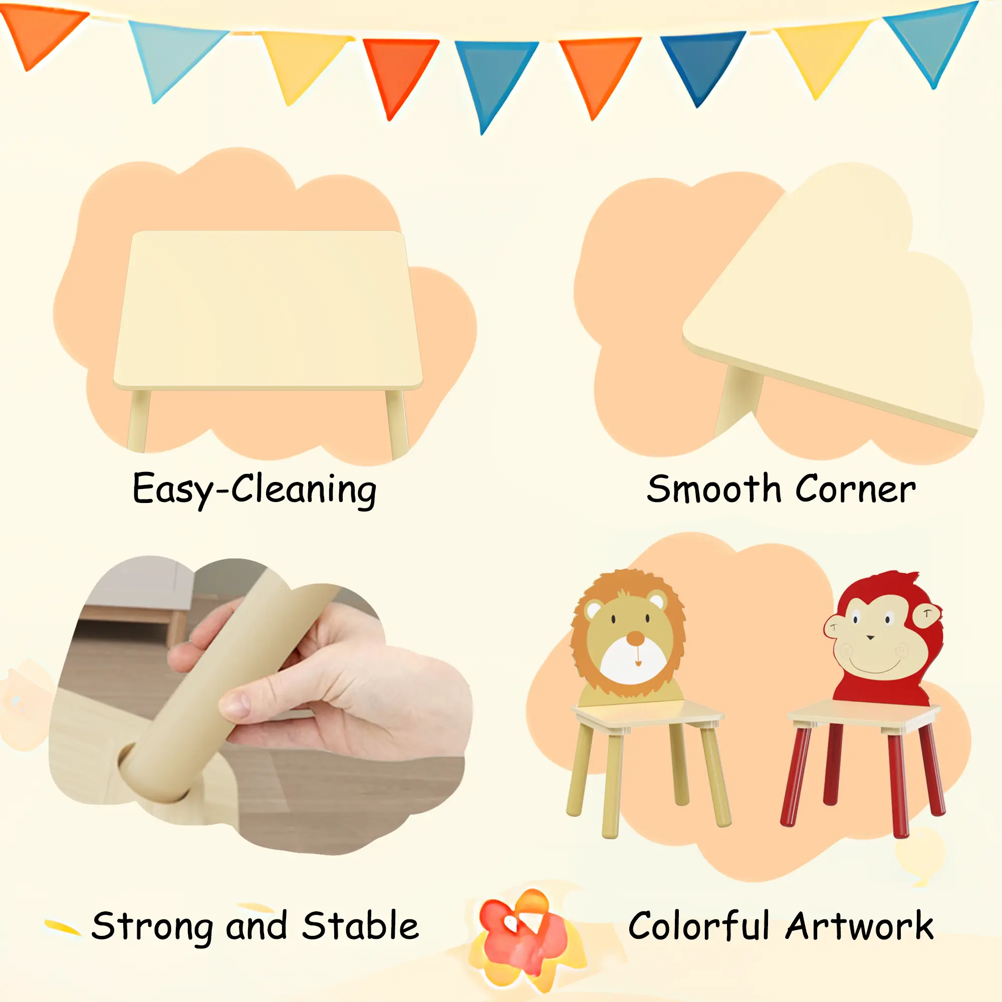 This 3-piece wooden set is perfect for kids aged 2-6. It features an animal theme with lion and monkey designs. Ideal for playrooms and nurseries, it encourages imaginative play. The table measures 23.6'' W x 23.6'' D x 17.3'' H, while each chair is 13.4'' W x 13.4'' D x 20.1'' H. The set weighs 9.4KG/20.72lb. Assembly is straightforward with detailed instructions and all necessary accessories included.