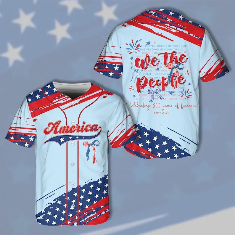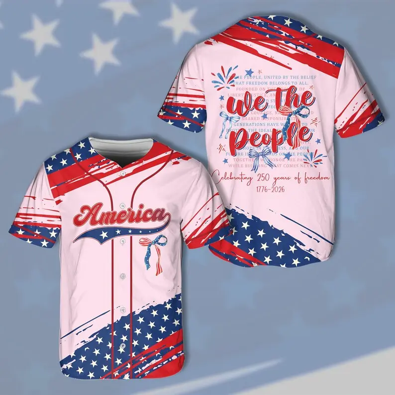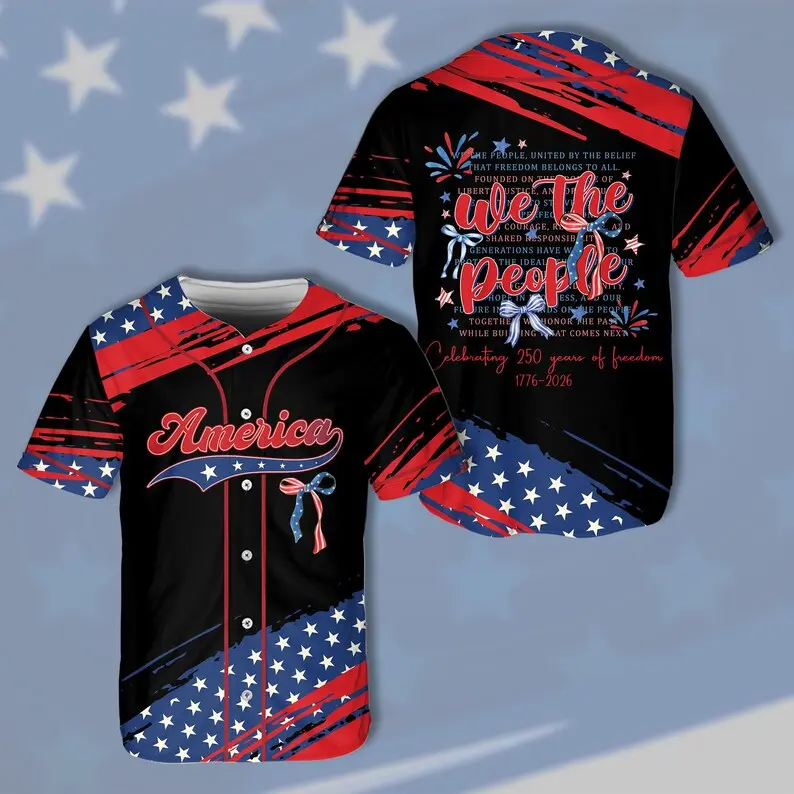 America 250 Years of Freedom 1776–2026 baseball jersey. Features We The People patriotic coquette bow design. Ideal for 4th of July. Multiple colors available.
