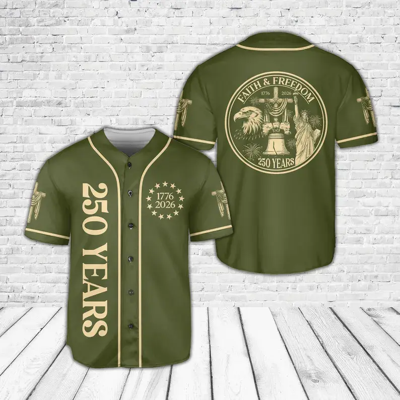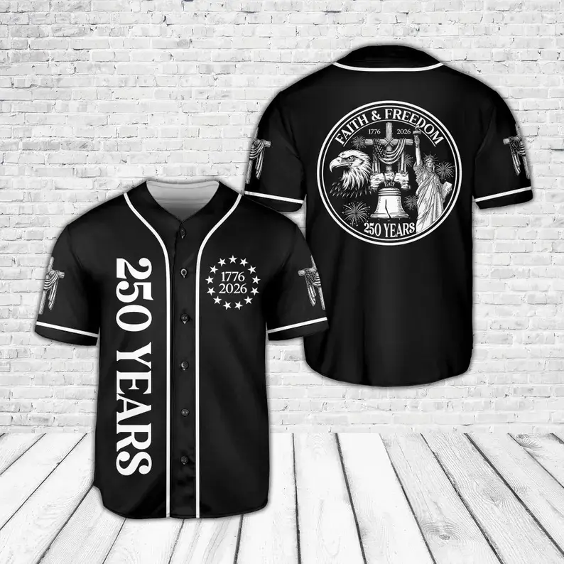 USA 250th Anniversary 1776–2026 baseball jersey. Features Christian cross & American flag. Celebrates faith and freedom. Perfect patriotic 4th of July gift.