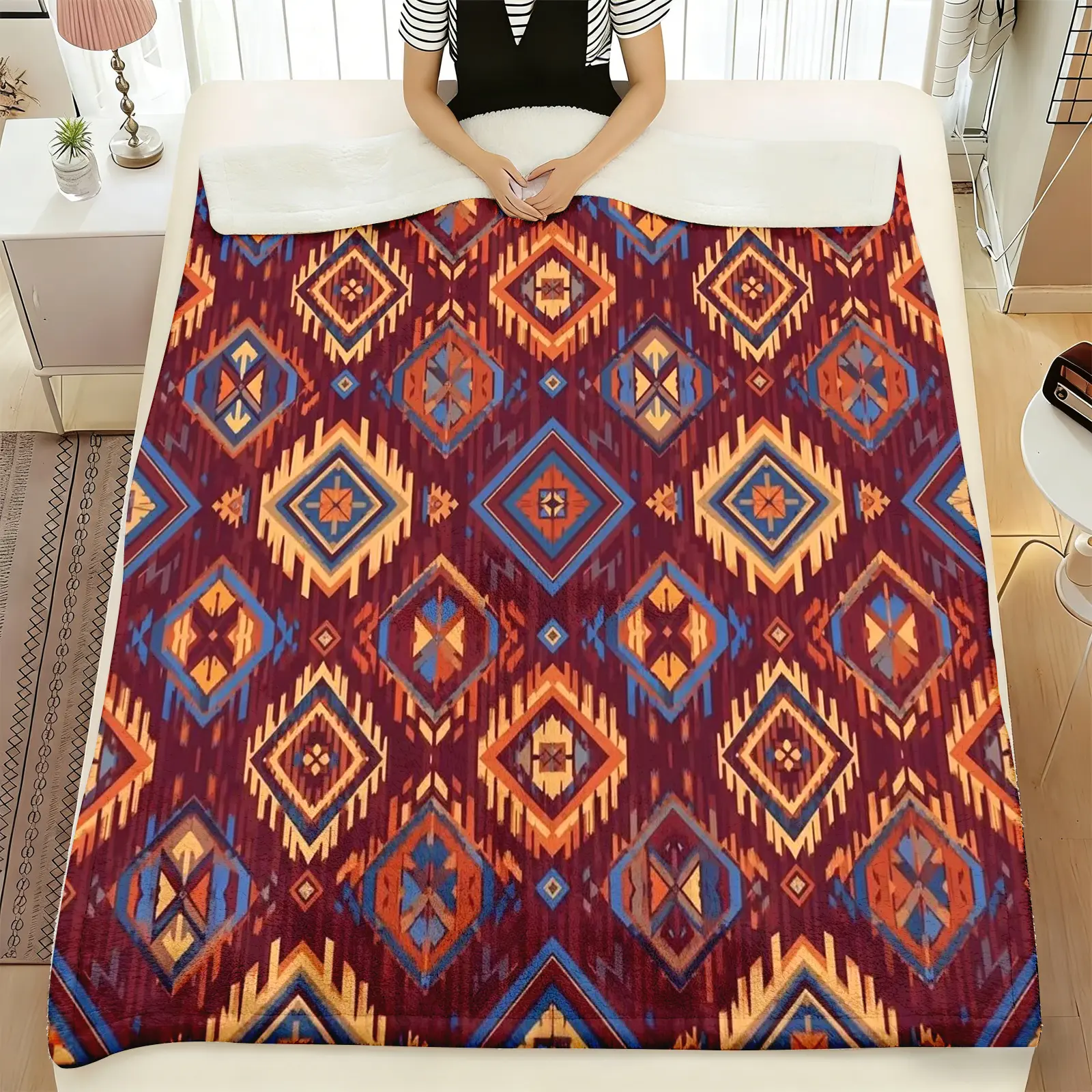 5. 1pc Geometric Print Flannel Blanket, Soft Warm Southwestern Geometric Throw Blanket, Cozy Plush Boho Blanket, Aztec Pattern Design Blanket, Ideal for Sofa Couch, Boho Home Decor, Birthday Gift 50"x60"
