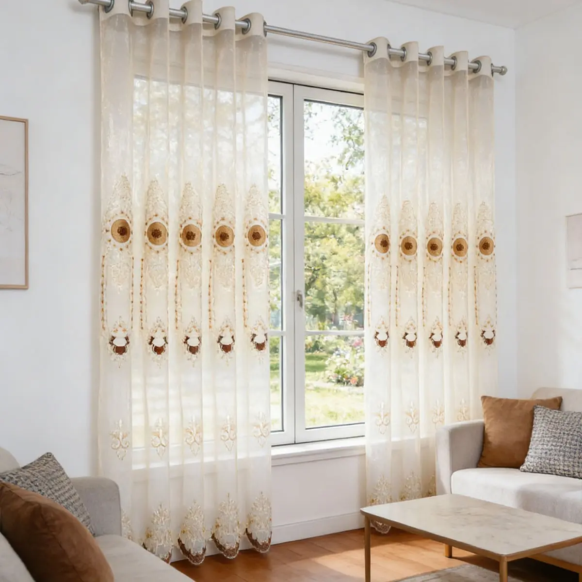Nice color. Drapes look and feel like good quality material and stitching. Like how they look. No huge grommets that go thru the curtain rod. You just need to slide the material thru the rod. Leaves a cleaner look. I'll purchase again Color: Just as shown.