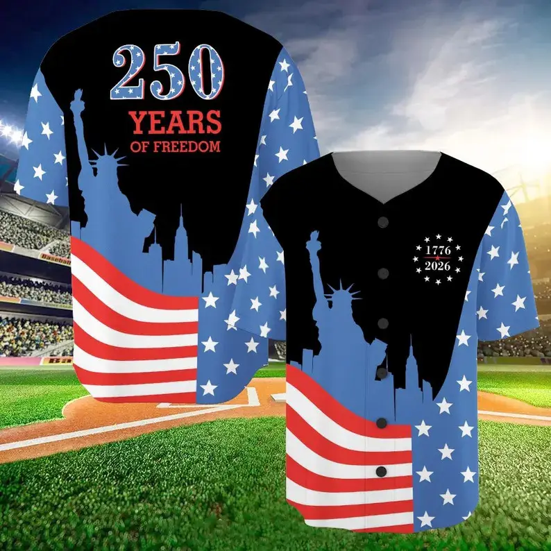 America 250th Anniversary 1776–2026 baseball jersey. Statue of Liberty & American flag patriotic design. Celebrates 250 years of freedom. Great Independence Day gift. Multiple colors available.