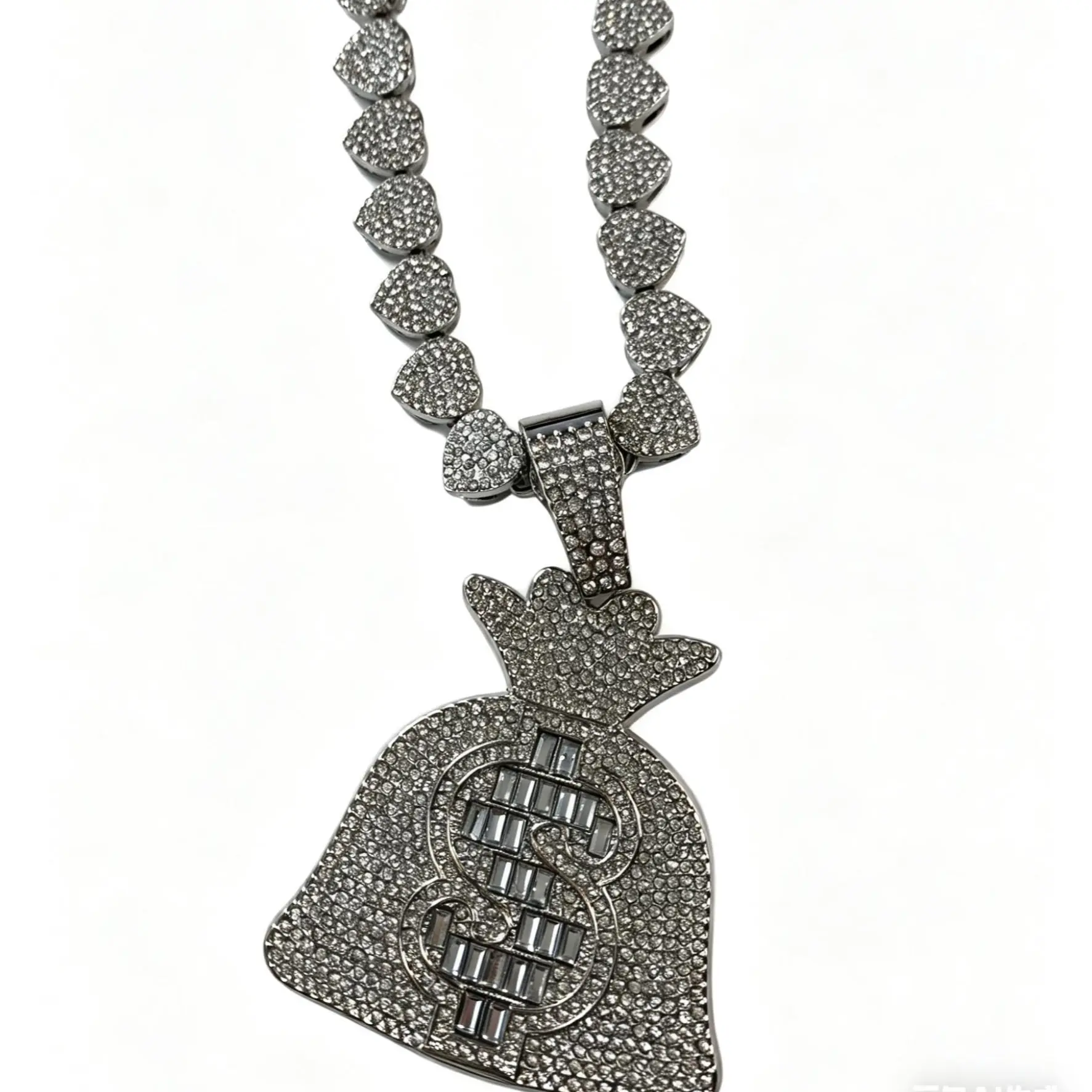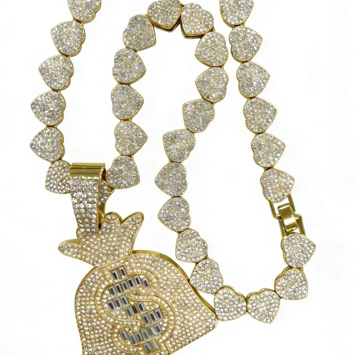 A money bag pendant studded with gemstones is paired with a 24-foot-long heart-shaped necklace.