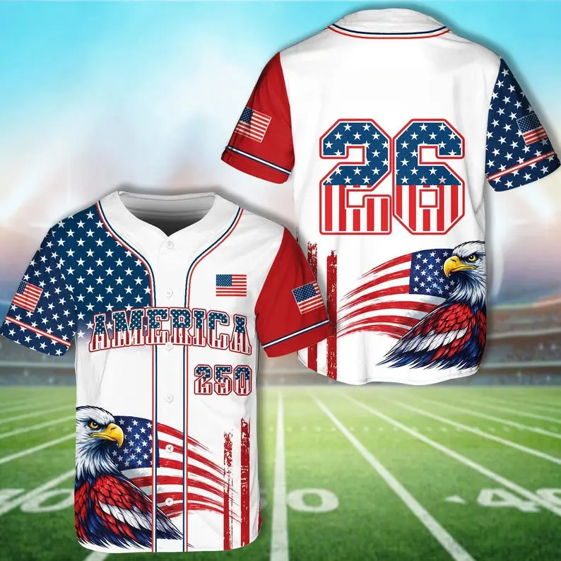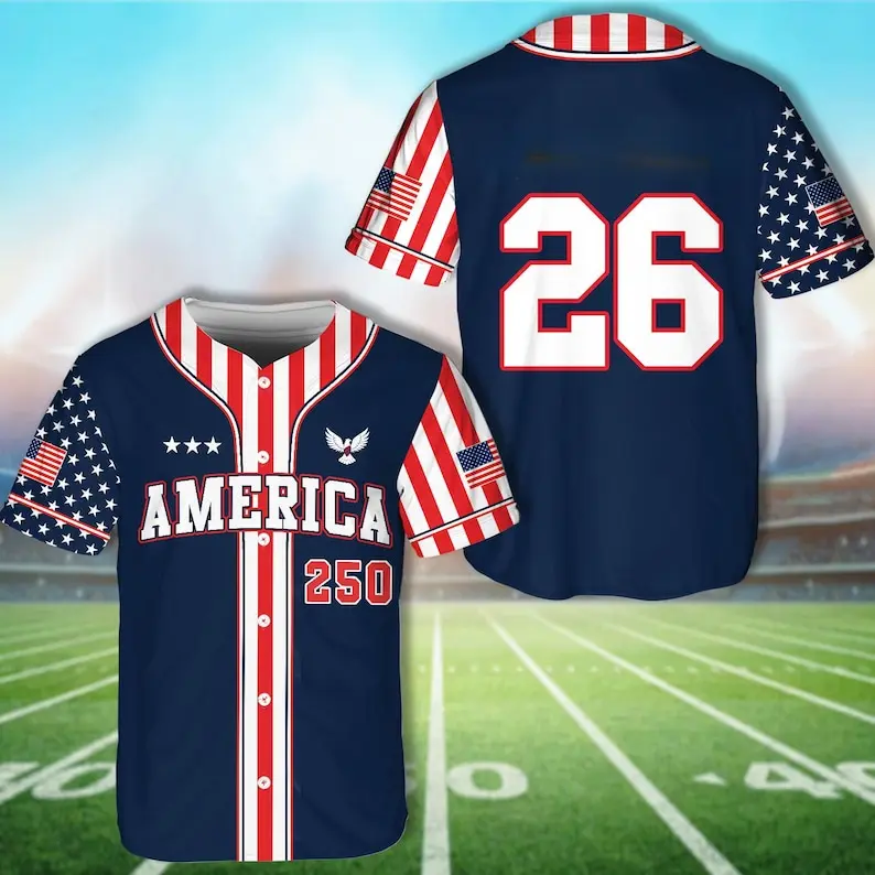 Adult USA baseball jersey featuring America 250th Anniversary 1776–2026 design. Perfect for Independence Day & 4th of July. Multiple colors available.