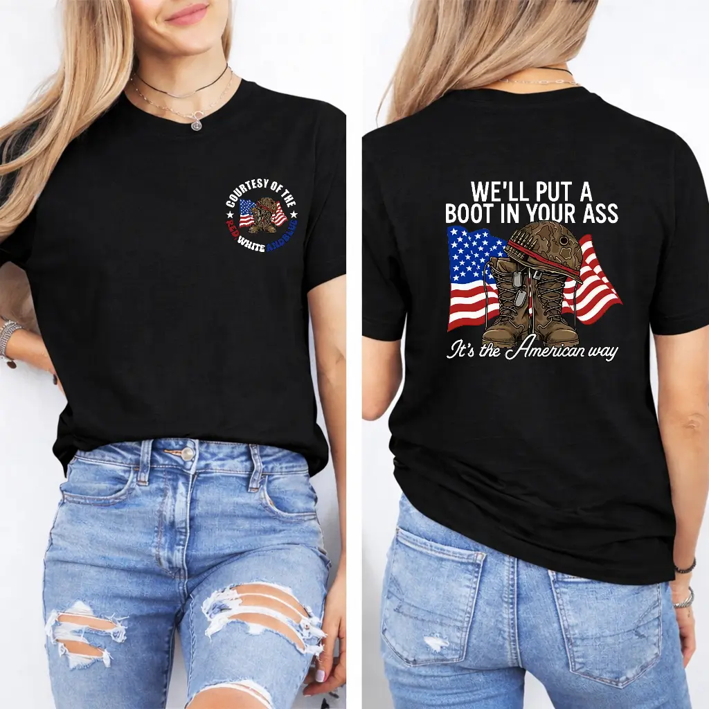 T - shirt with "WE'LL PUT A BOOT IN YOUR ASS" slogan, American flag & military boot graphic, front "CONTEST OF THE RED WHITE AND BLUE" design