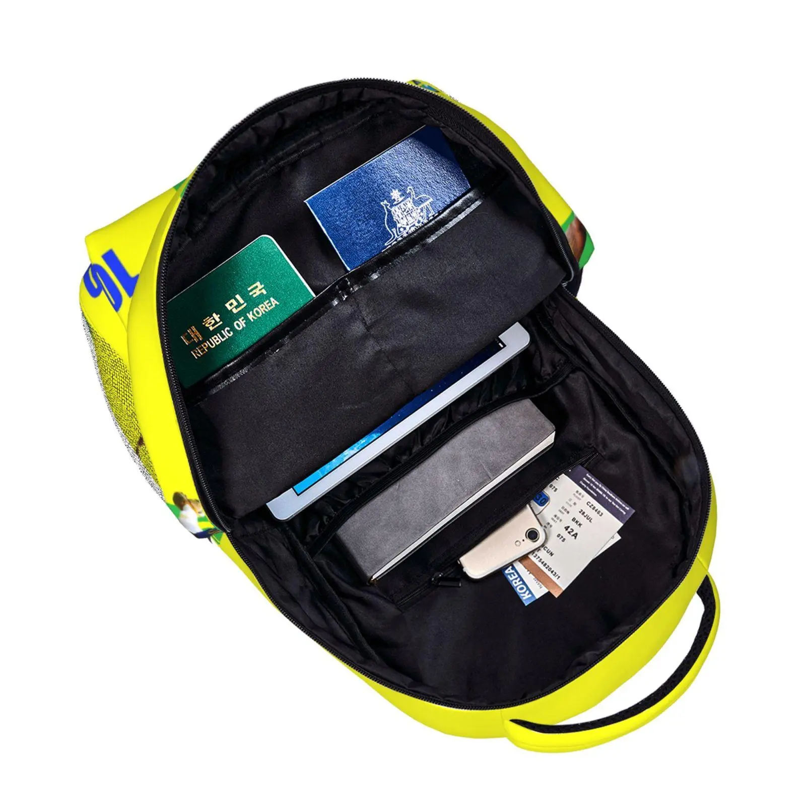 ✨ Spacious & Well-OrganizedMeasuring 11.42" L × 5.12" W × 14.57" H, this Brazilian Players laptop backpack provides generous storage space. The main compartment with internal pockets keeps magazines, clothing, documents, and folders neatly organized. It also has a front zippered pocket and expandable side pockets for water bottles, umbrellas, small accessories, and snacks, making it highly practical for work, school, and travel.