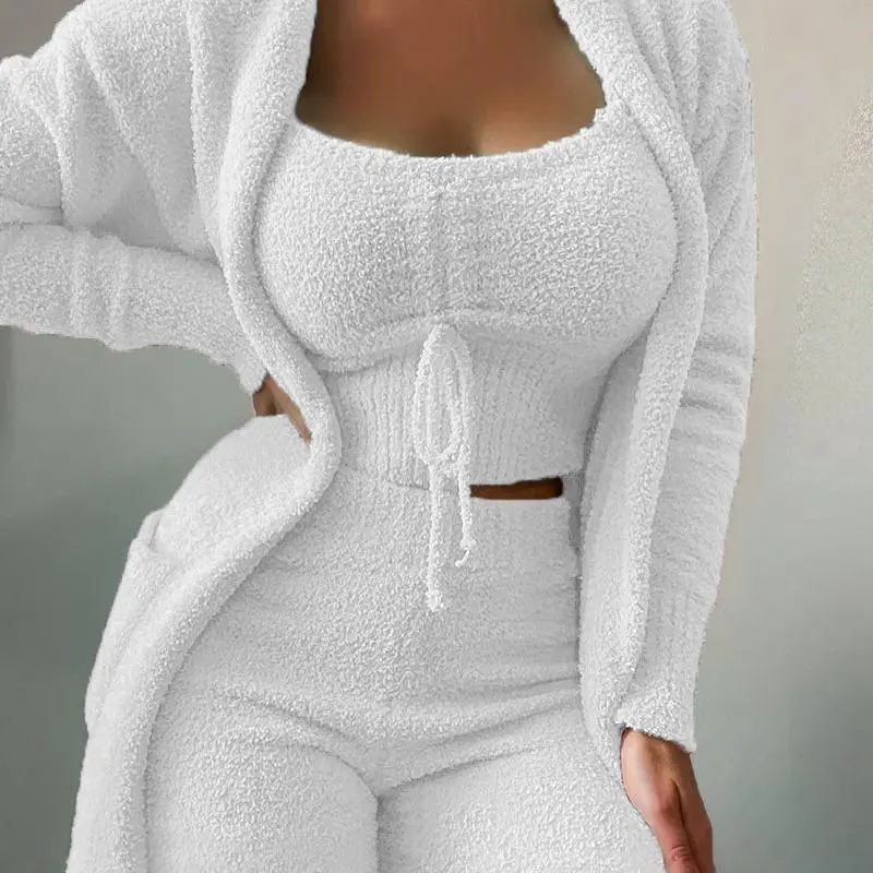 This cozy plush loungewear set is ideal for all seasons.The 3-piece set includes a lace-up top, matching pants, and a coordinating cardigan.It's perfect for home and lounge wear, offering comfort and style.🛋️