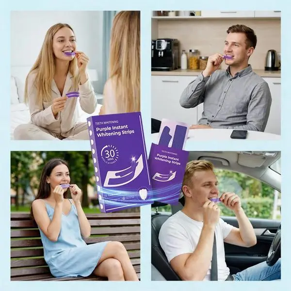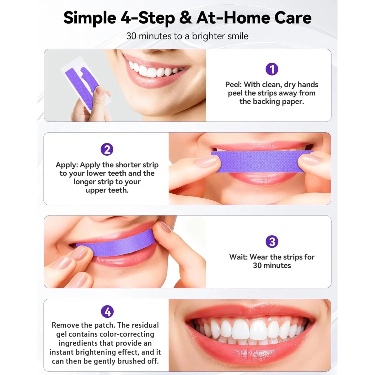 Features an ultra-thin gel layer that hugs your teeth, staying stable for 30 minutes. It peels off easily, leaving no sticky residue. Individually packaged for on-the-go use, apply for 30 minutes, remove, and discard. Efficient and convenient, these strips integrate seamlessly into your daily life.