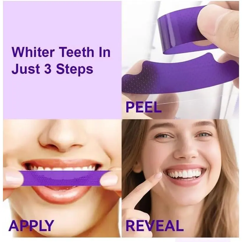 Visibly whiter teeth in just 7-14 days! Our Purple Teeth Whitening Strips offer professional-grade results without pain. Ideal for coffee and tea lovers, these strips neutralize stubborn stains, giving you a radiant smile. Each box contains 28 strips, providing a full two-week regimen. Perfect for men and women, these strips are safe for enamel and non-sensitive teeth.