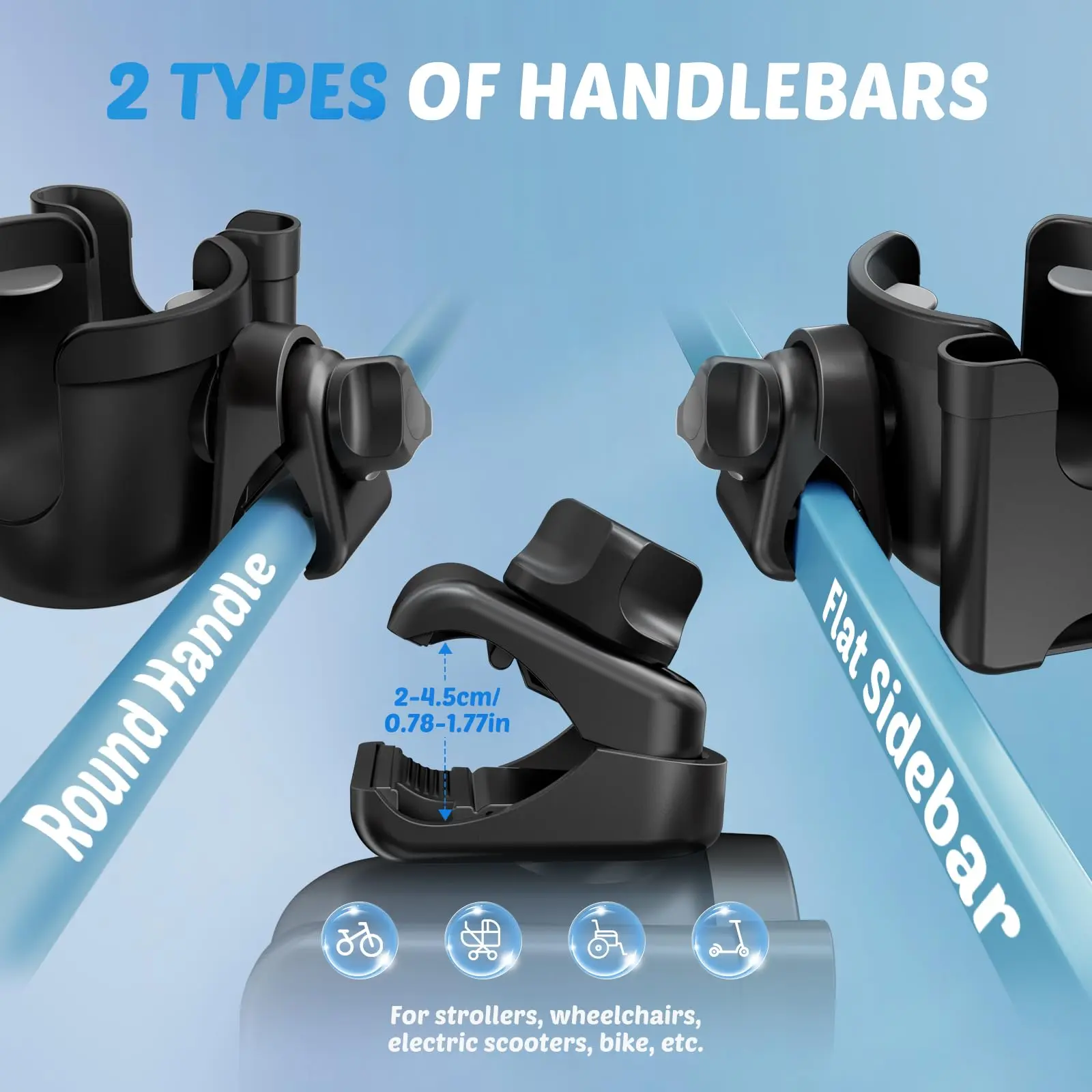 The handlebar clamp is lined with silicone pads, ensuring the universal cup holder is locked in place. It can be installed on both the handlebar and the sidebar, fits round bar and flat bar. Perfect for baby bottles, travel mugs, insulated cups, water bottles, and coffee cups.
