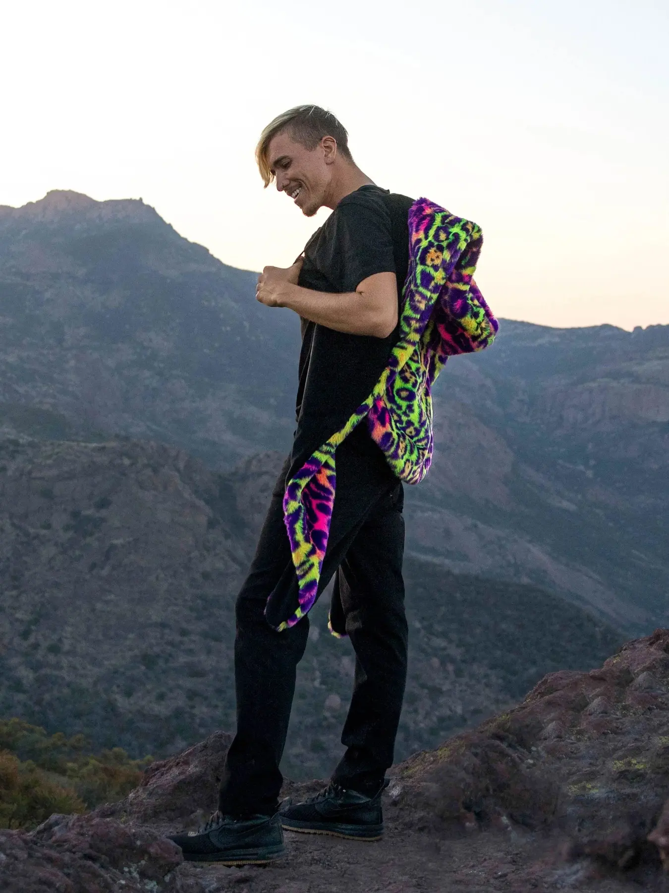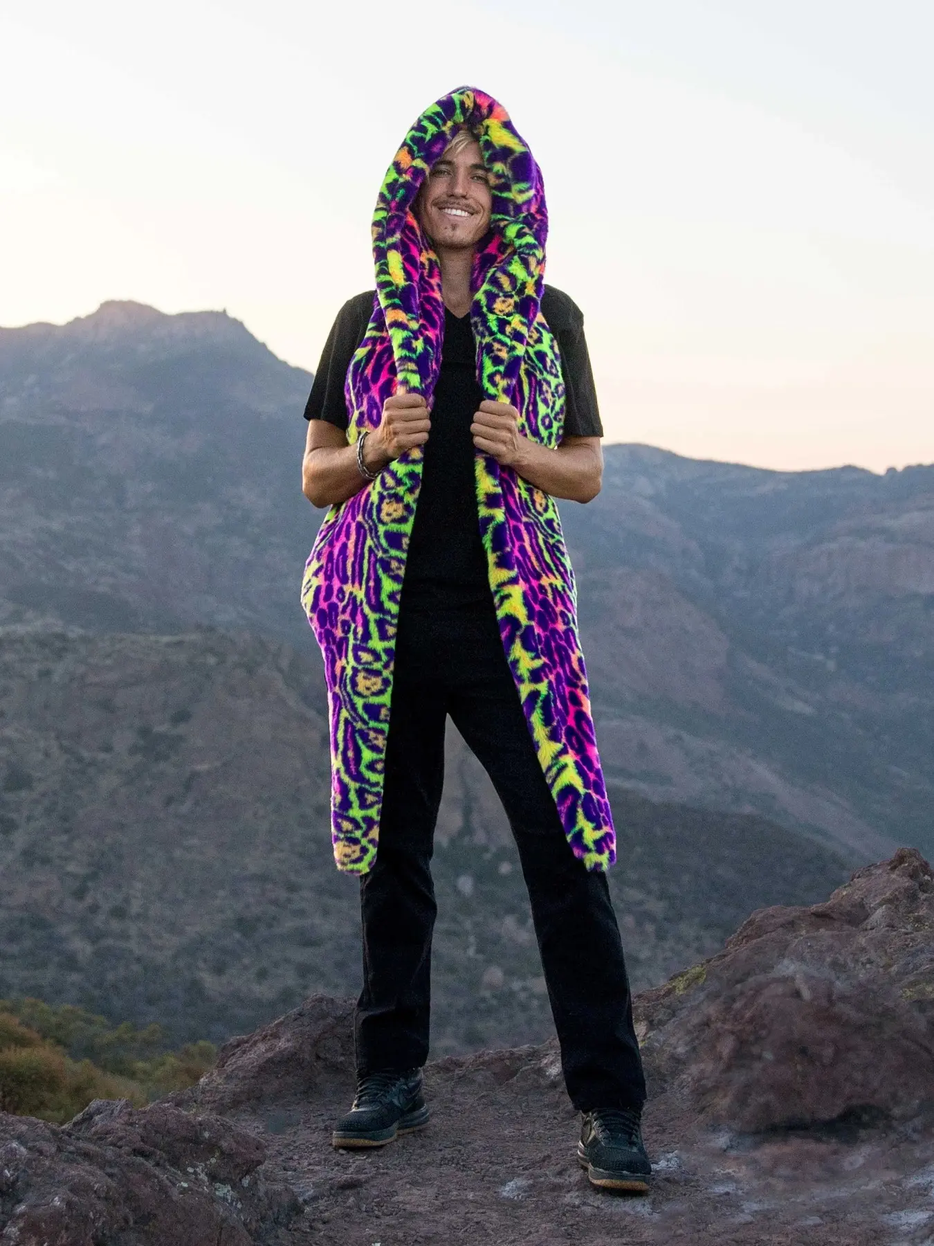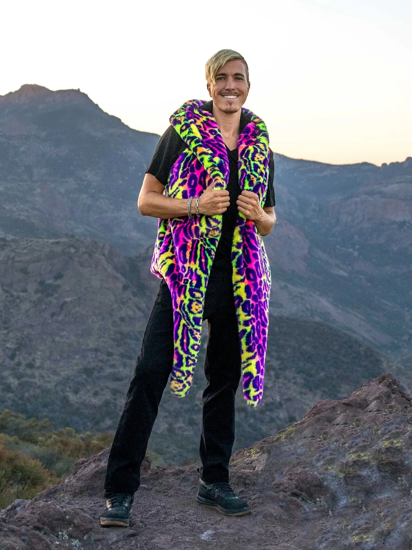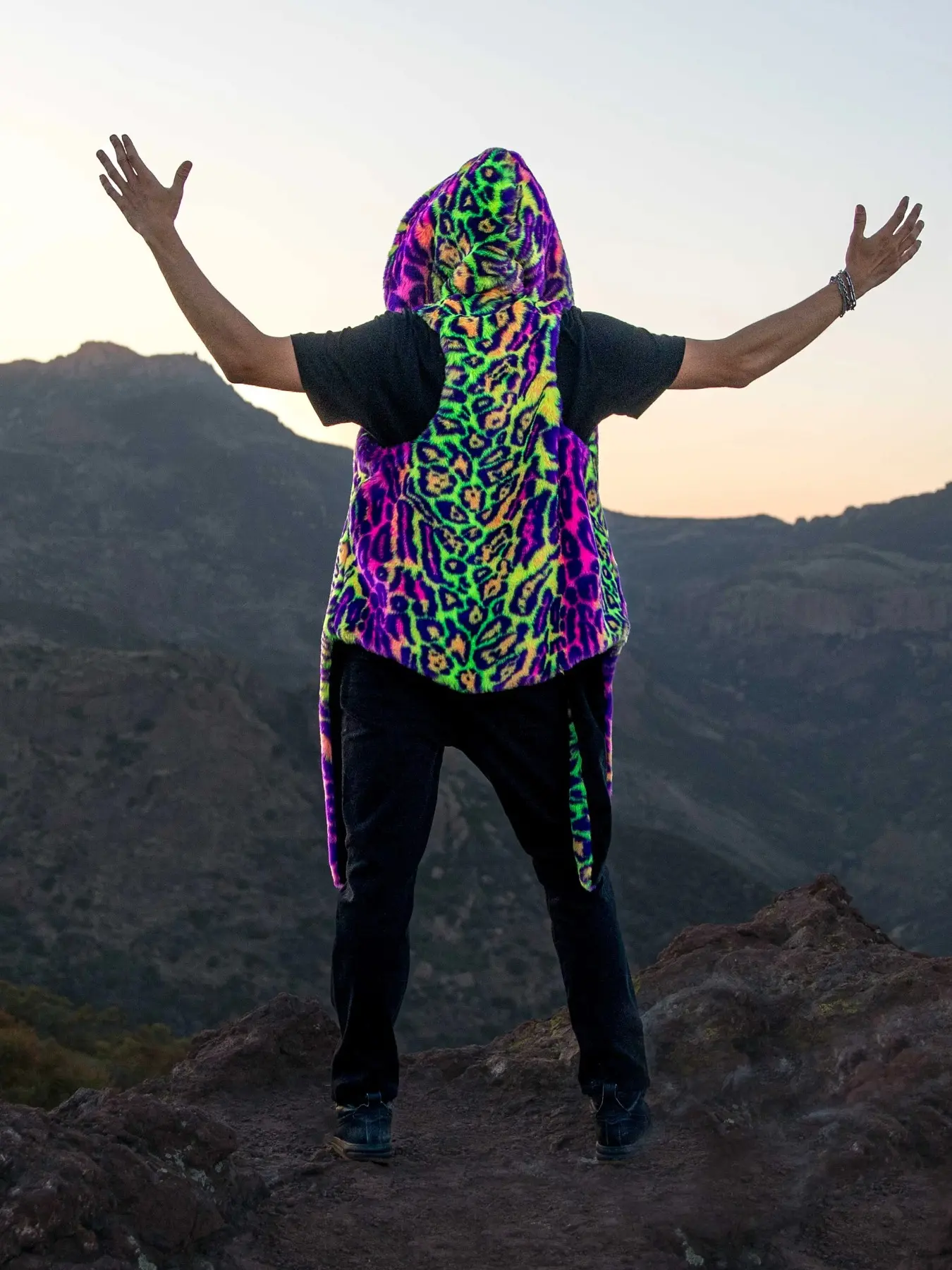 Men's Street Style Vest Short Neon Leopard Faux Fur Jacket, Hooded Windproof Warm Coat, Soft Polyester Interior, Spring & Fall Fashion