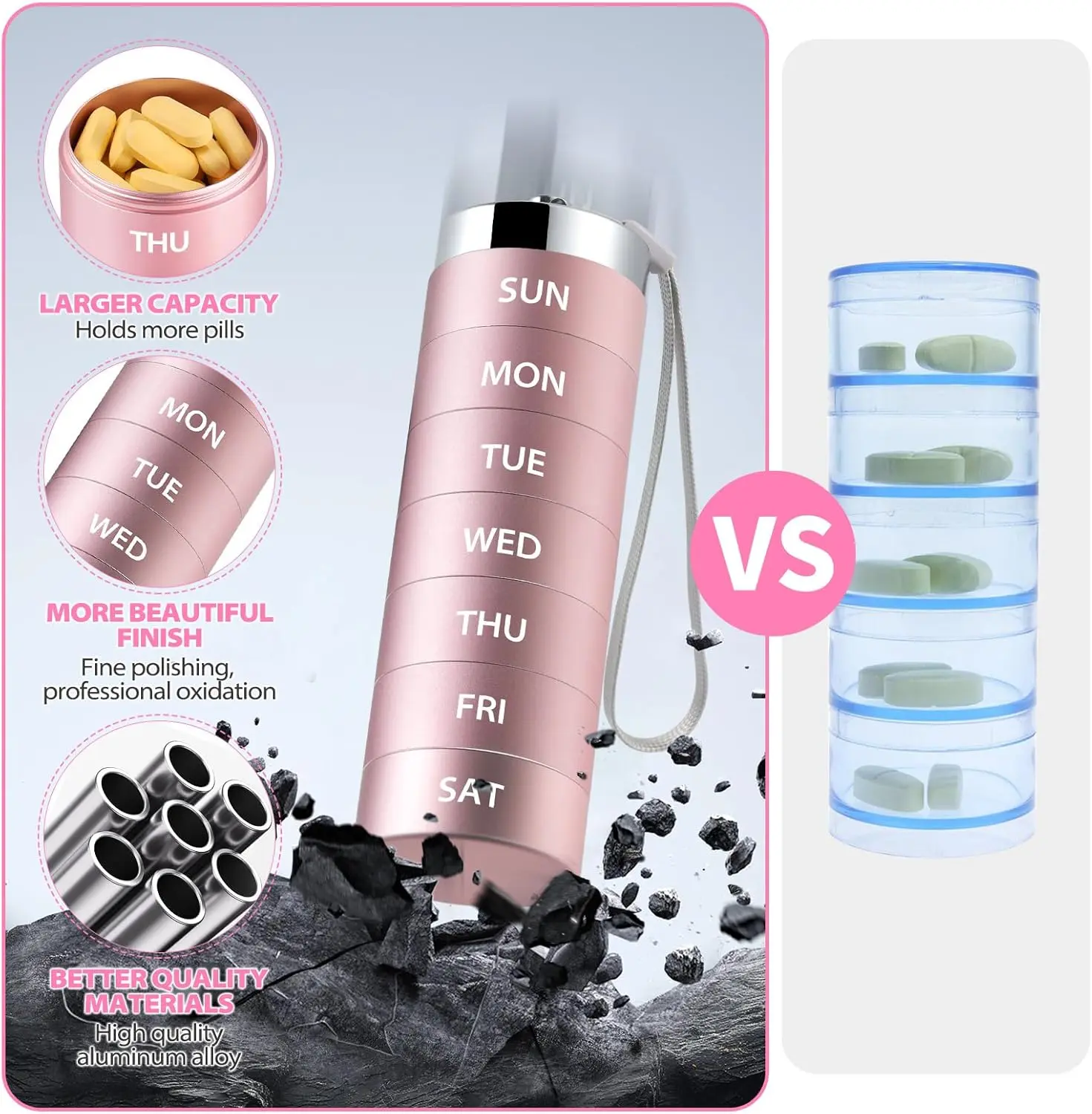 📅 The dates on the metal case are laser engraved. These letters are permanent, ensuring clarity and longevity. No erasing worries, just clear, lasting dates for each day. The organizer includes days like SUN, MON, TUE, WED, THU, FRI, SAT.