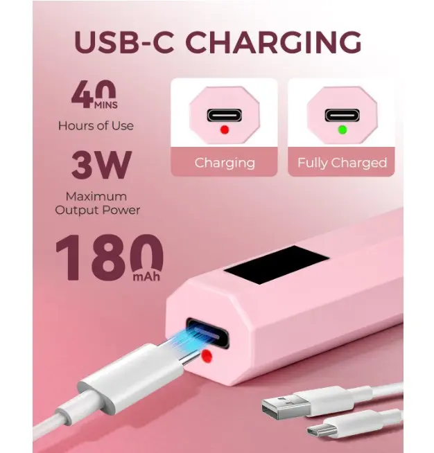 ·COMPACT & PORTABLE: Handheld uv light for nails design, size only 4.05*0.82*0.74in, unique hexagonal design, fit our grip.180mAh USB-C charging, long battery life after fully charged uv light for gel nails